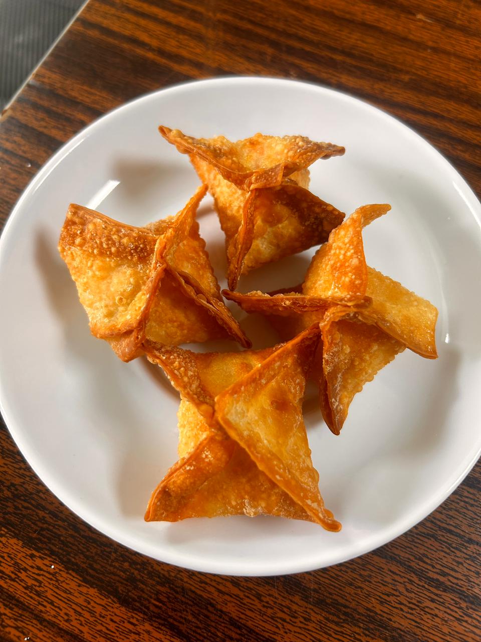 4 Deliciosos wontons rellenos de pasta de surimi con queso crema y cebollín.
