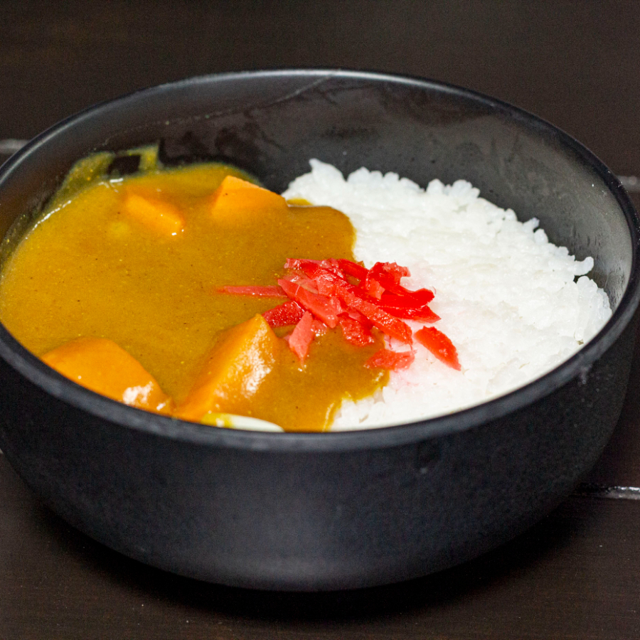 Bowl de arroz con un delicioso topping de curry de la casa. Incluye zanahorias y papas.