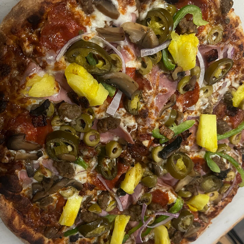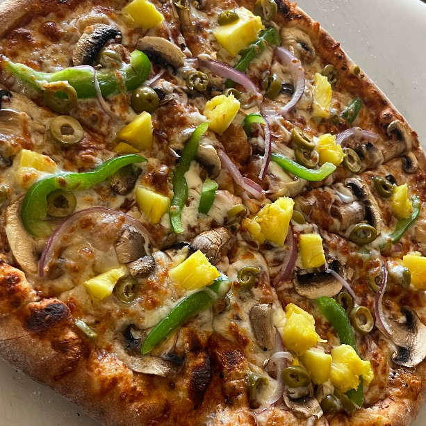 Aceitunas, cebolla, champiñones, pimiento verde, piña y queso parmesano