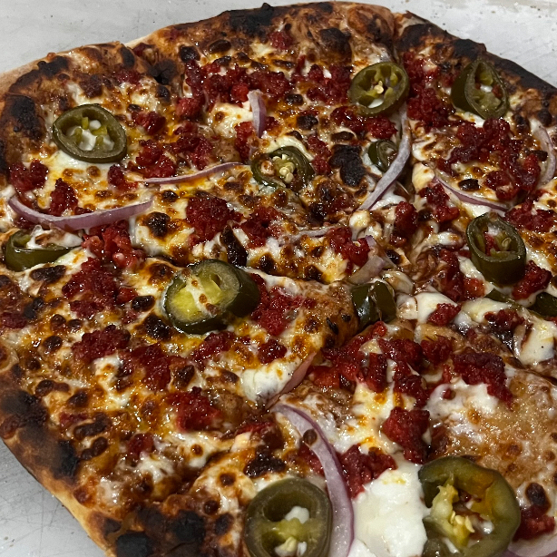 chorizo español, chile jalapeño, cebolla