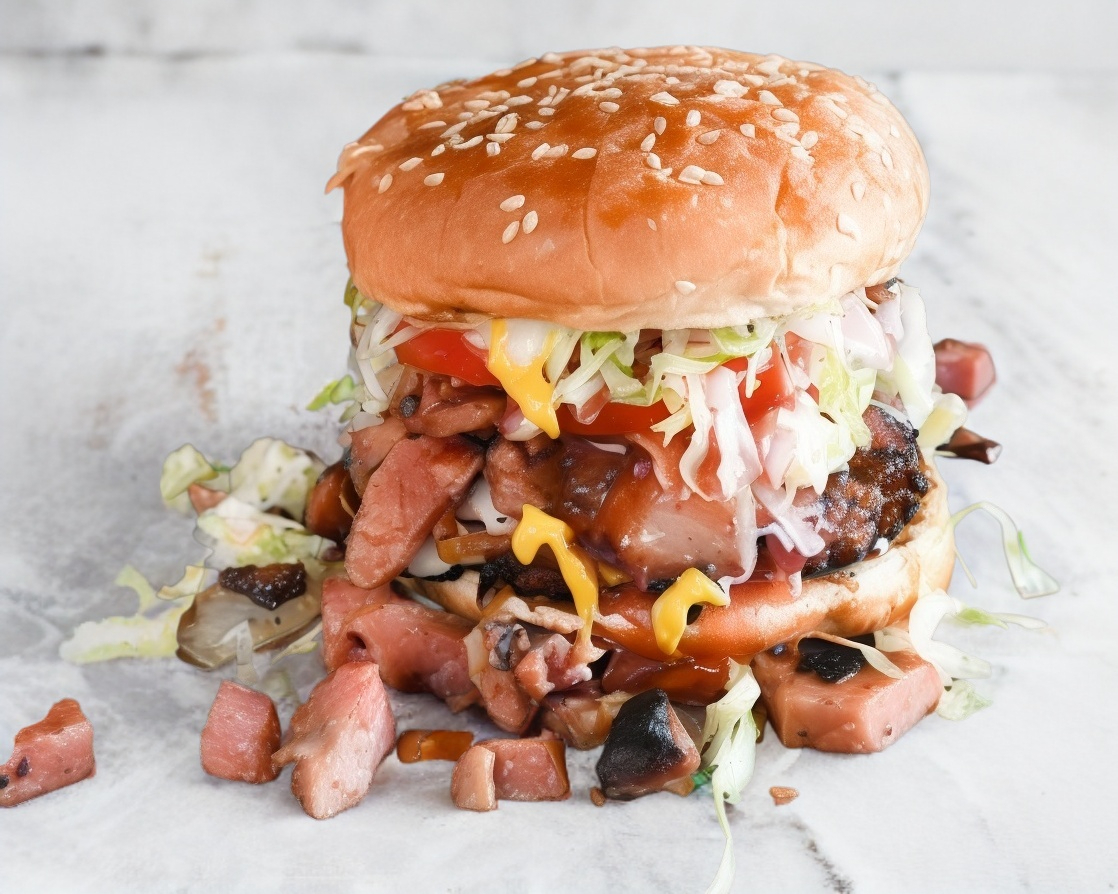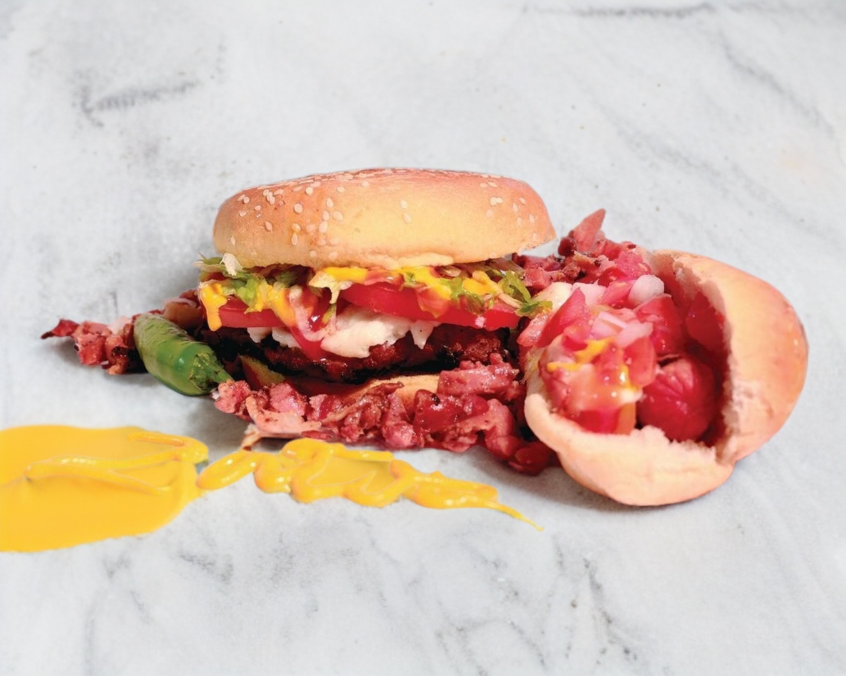 Hamburguesa con doble carne, queso asadero, lechuga, tomate, cátsup y mayonesa, acompañada de nuestra receta secreta de carnes frías y chiles en vinagre de la casa.