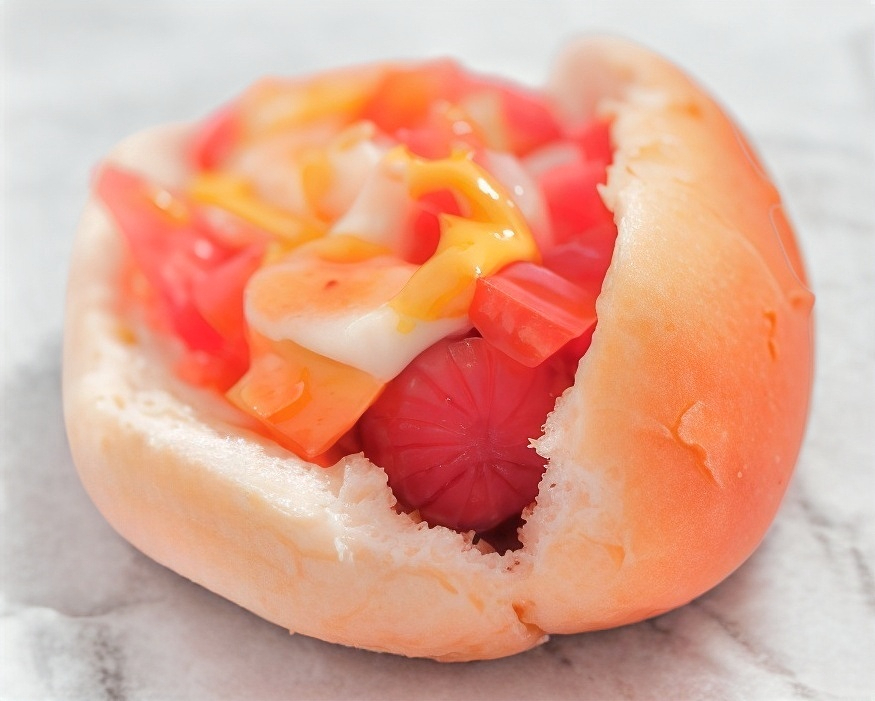 Media noche con salchicha, cebolla, tomate, mayonesa, mostaza y cátsup, acompañada de nuestra receta secreta de carnes frías y chiles en vinagre de la casa