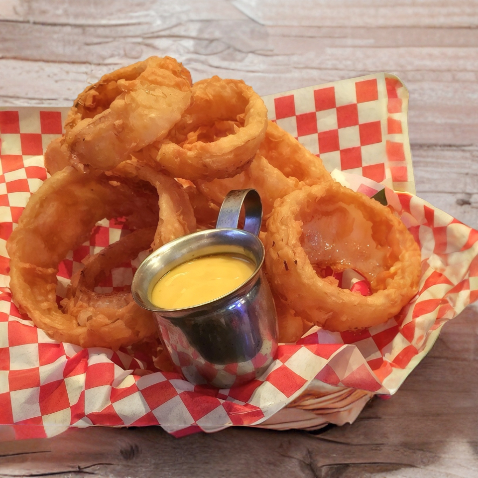 Aros de cebolla capeados con nuestra receta secreta. Acompañados con aderezo honey mustard.