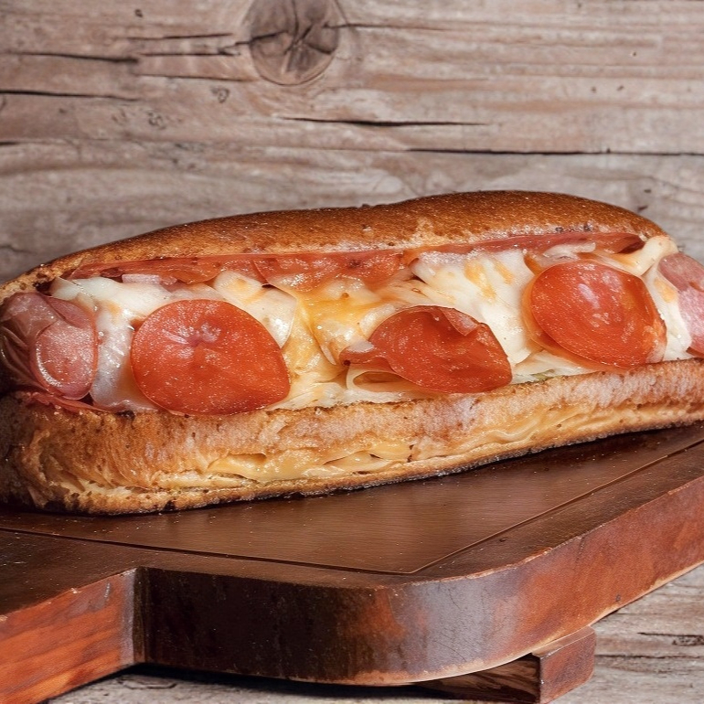 Delicioso hot dog con nuestro pan de la casa, con salsa de pizza, queso mozzarella y pepperoni.
