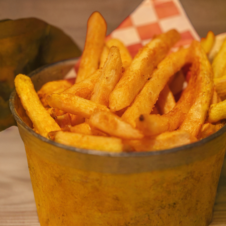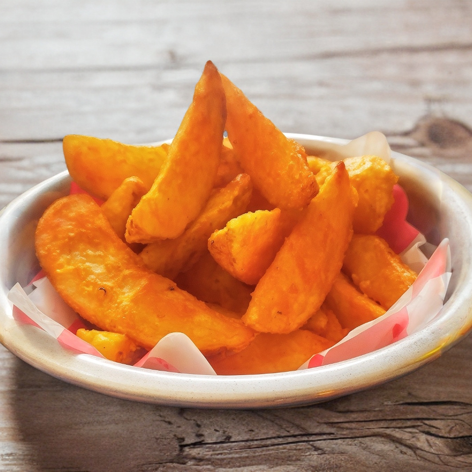Papas cortadas en forma de gajo con cubierta especial de especias de la casa hechas al momento.
