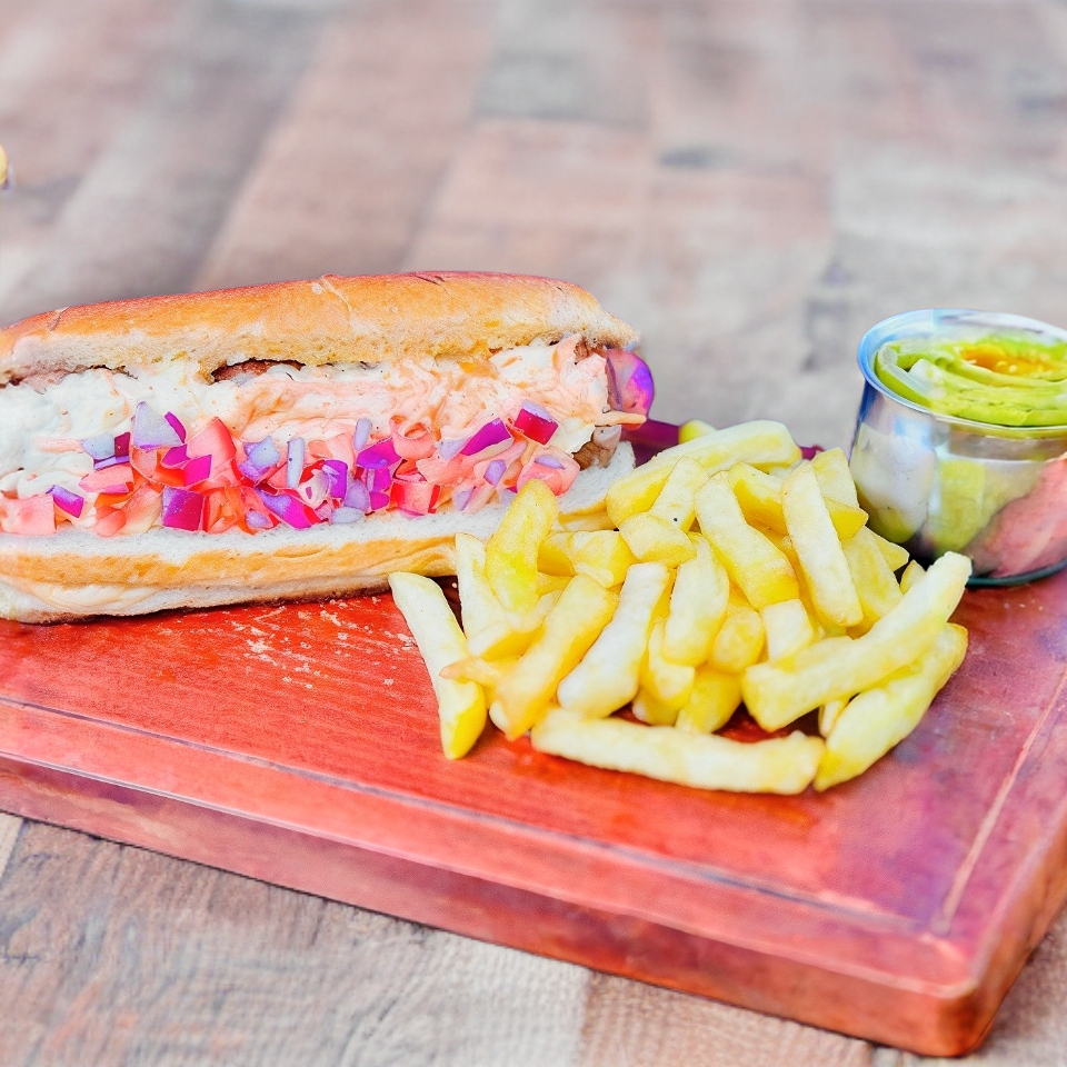 Delicioso hot dog con jamón y piña. Salteados, cubiertos con queso mozzarella gratinado. incluye una porcion de papas a la francesa.