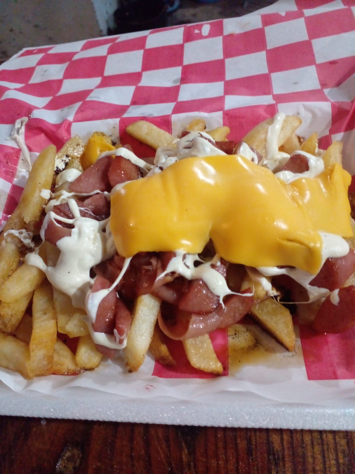 Papas, salchicha, jamón, tocino, asadero y queso amarillo, cátsup, chiles en escabeche o toreados.