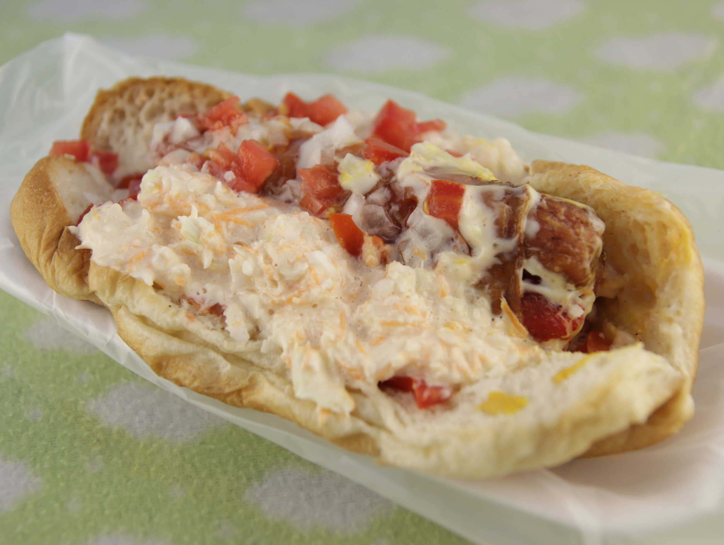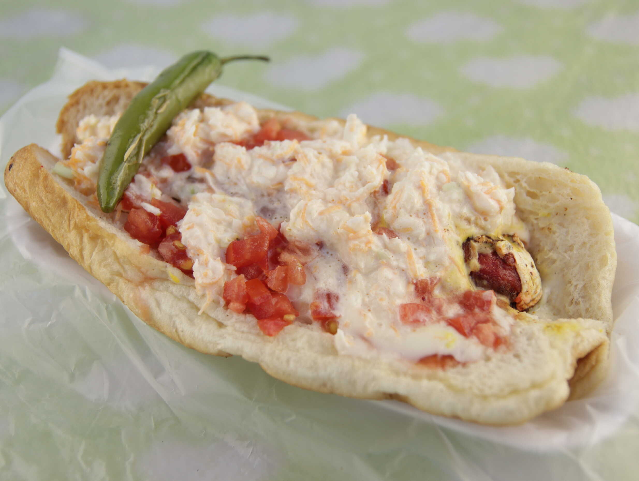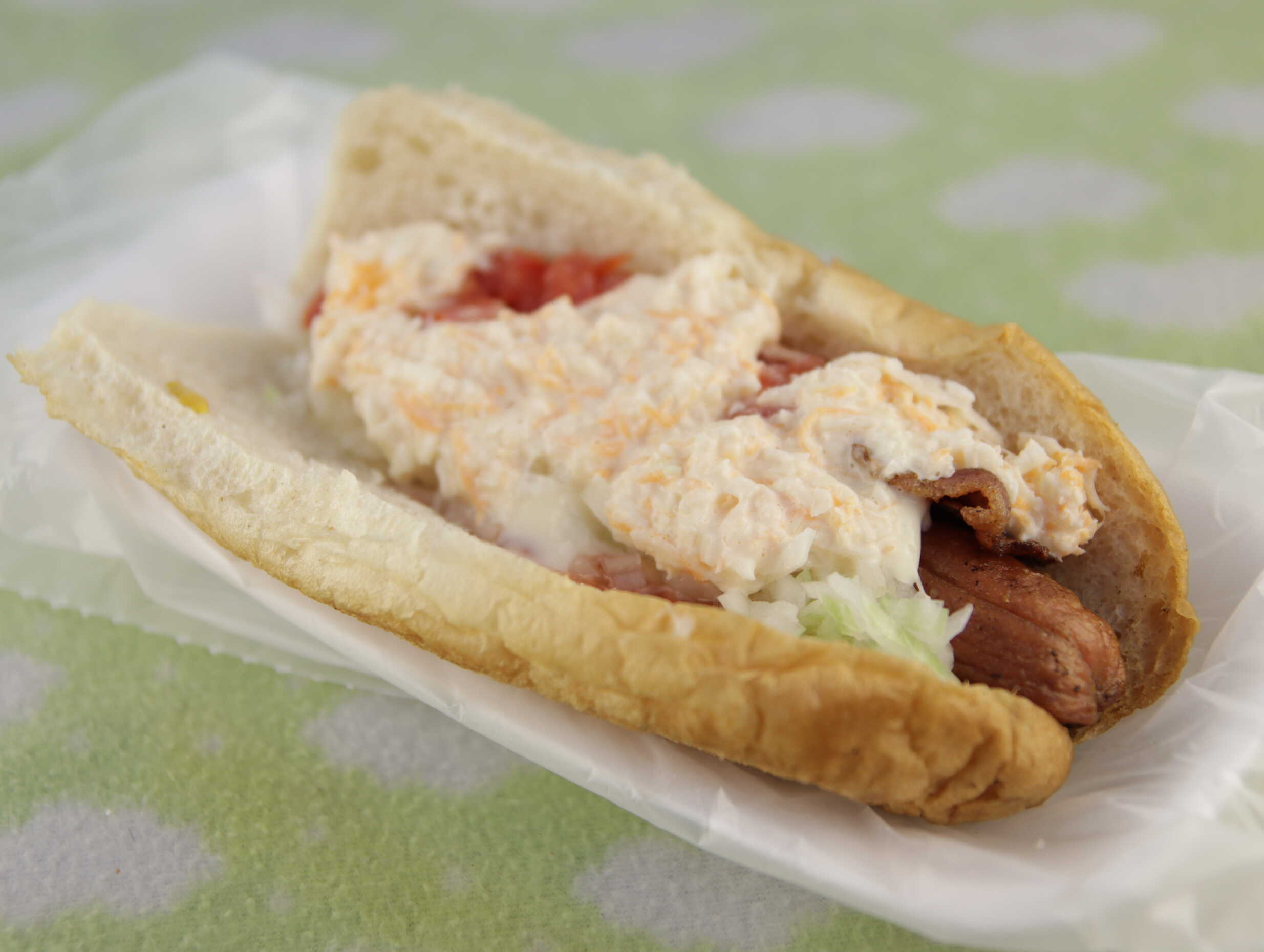 Salchichón envuelto en asadero y tocino , mayonesa, cátsup, mostaza, tomate, cebolla y ensalada, chiles toreados o en escabeche.
