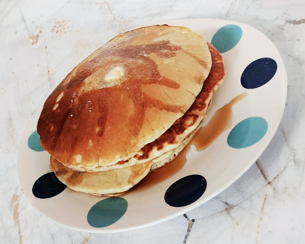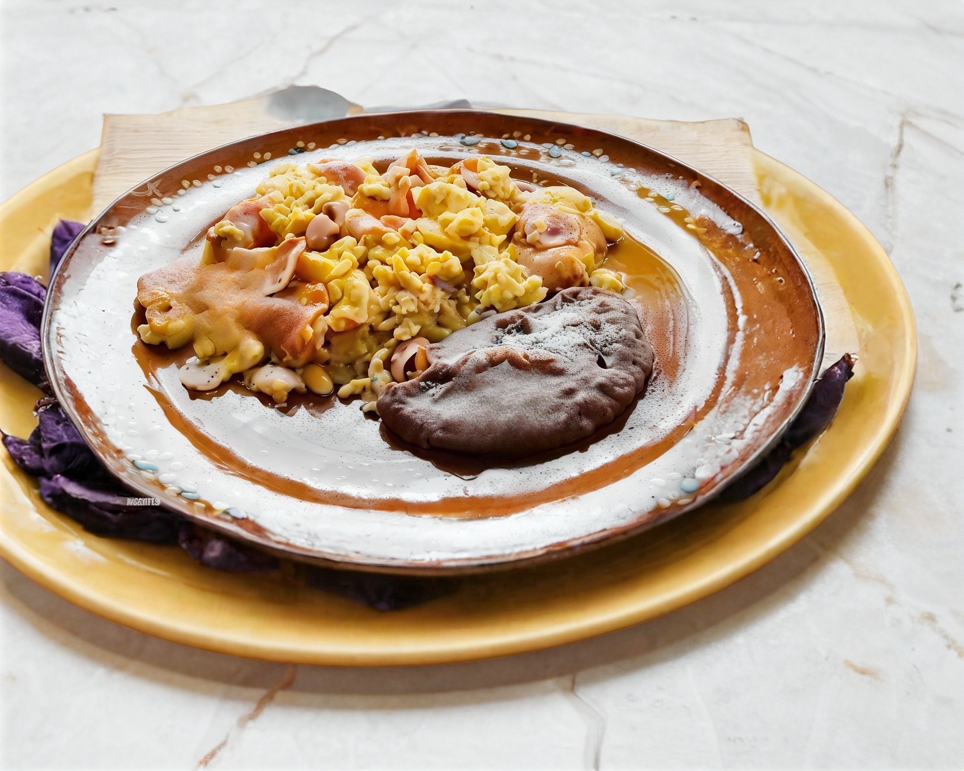 Dos piezas de huevos revueltos con jamón acompañados de frijolitos y tortillas recien hechas