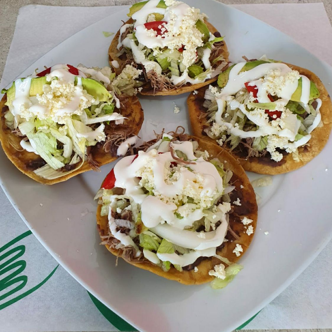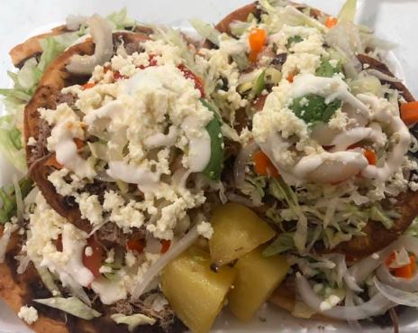Base de maiz frita diametro aproximadamente de 18cm cubierta de frijoles, carne deshebrada de res, lechuga, tomate, cebolla, queso y crema