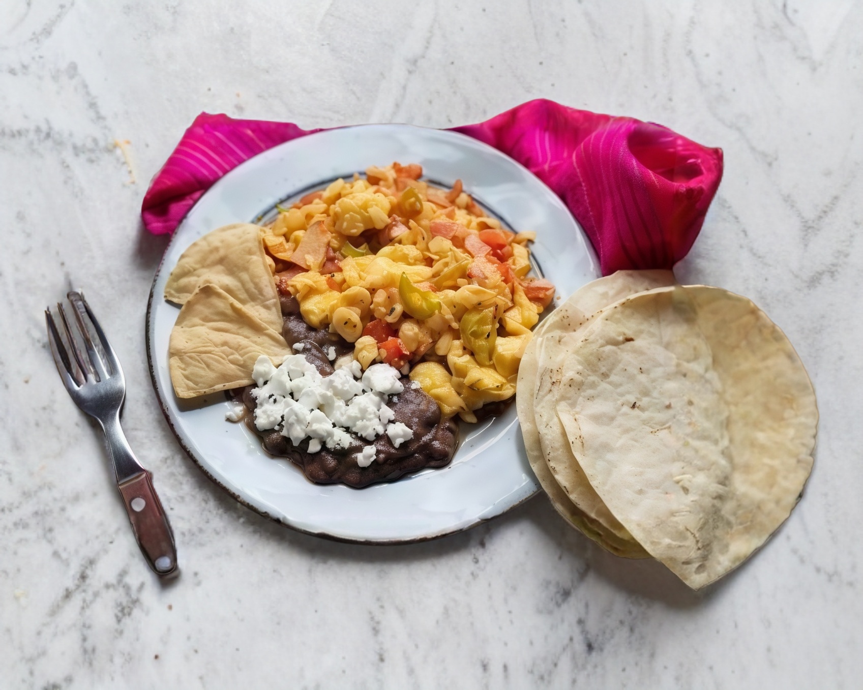 Dos piezas de huevo revueltos con tomate chile y cebolla acompañados de frijolitos y tortillas recien hechas