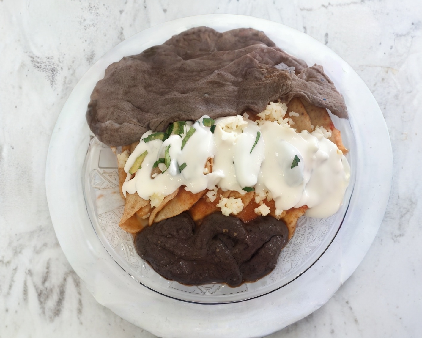 Totopos de tortilla frita bañada en salsa de tomate con un ligero toque picante con queso cebolla crema y aguacate acompañados de frijolitos