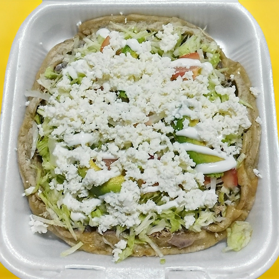 Frijol carne deshebrada, lechuga, tomate, cebolla, aguacate, crema, queso