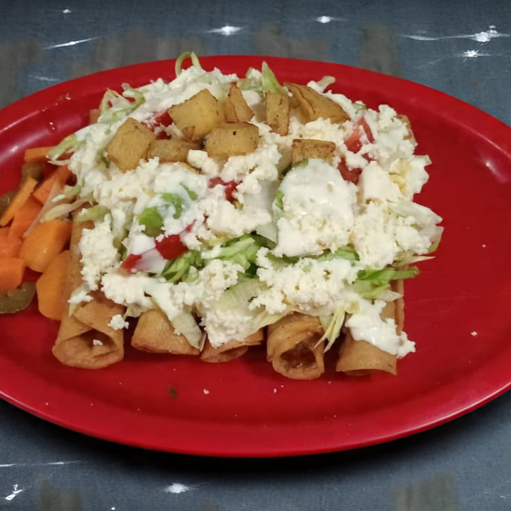 Rellenos de frijol con carne deshebrada, lechuga, tomate, cebolla, aguacate, crema, queso