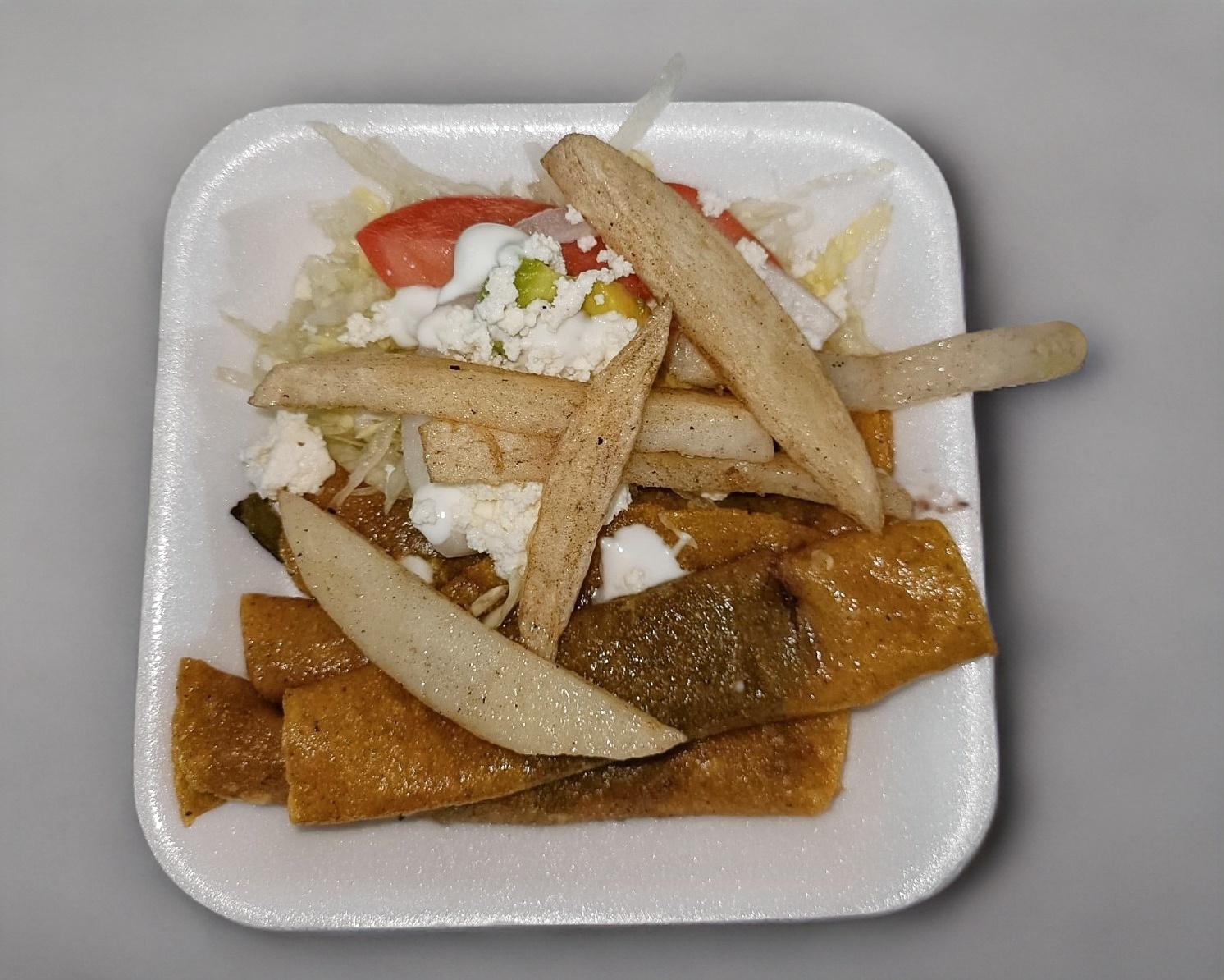 Quesadillas 4pza., Papas a la francesa, Crema, Aguacate, Queso, Cebolla y Tomate.