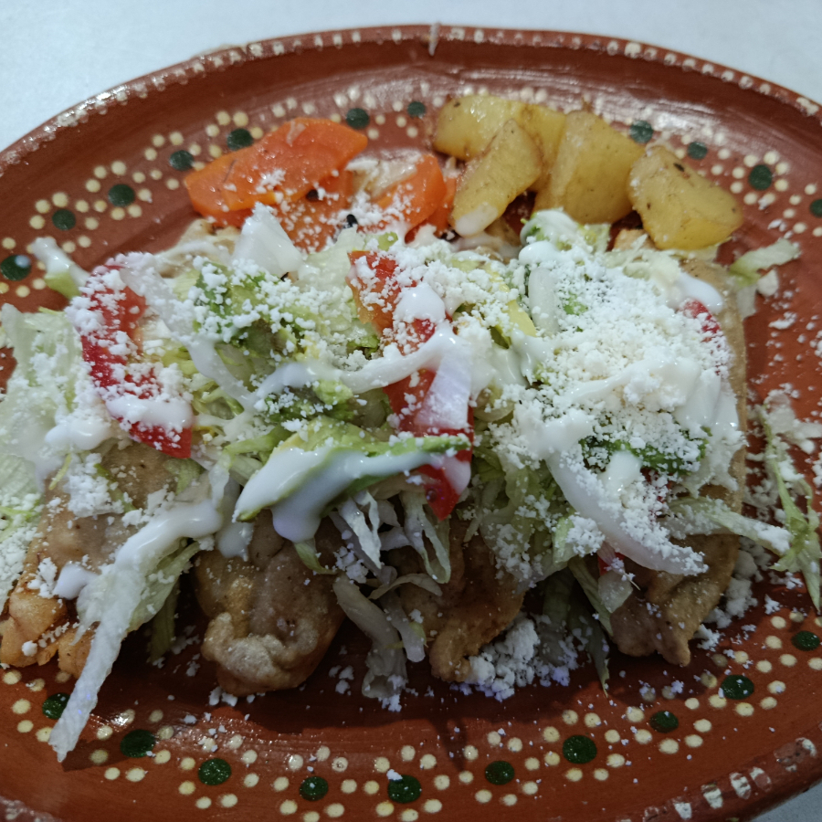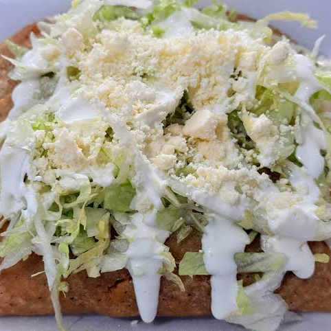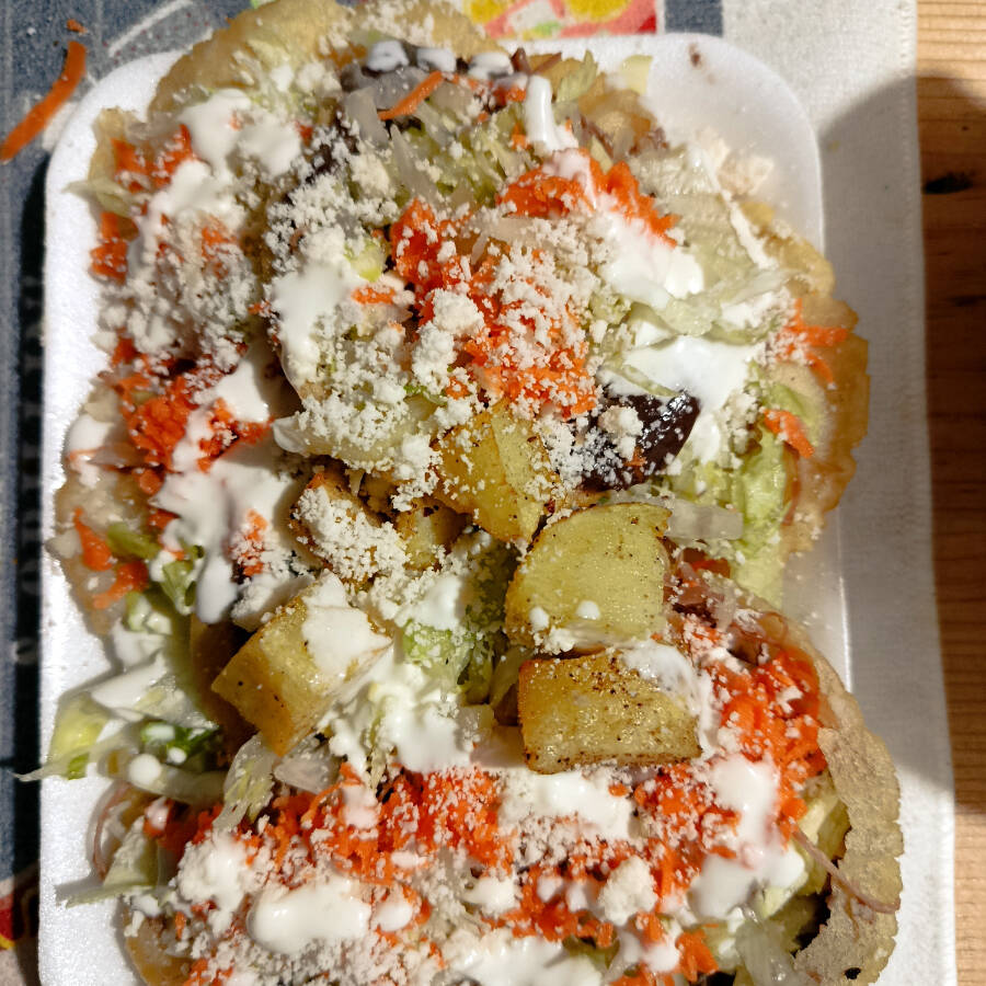 Tortilla de maizfrita con frijoles, carne desebrada, lechuga, zanahorias, queso, crema y papas
