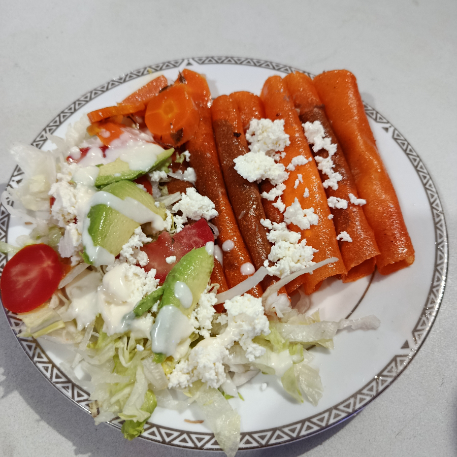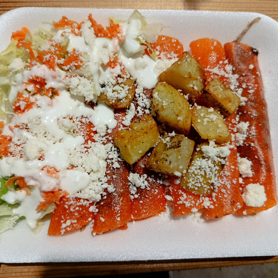 Tortilla roja con frijoles, carne desebrada, lechuga, zanahorias, queso, crema y papas