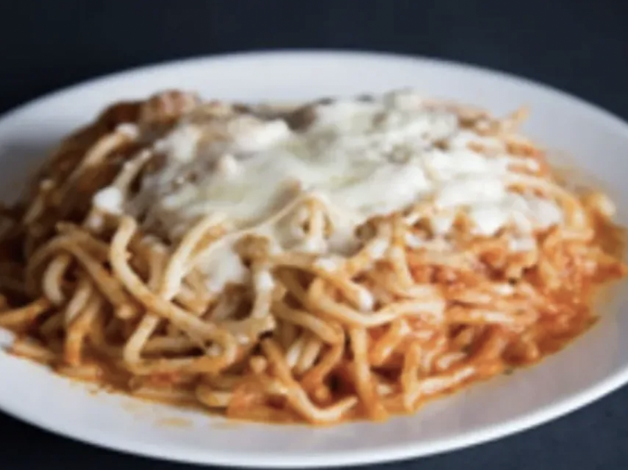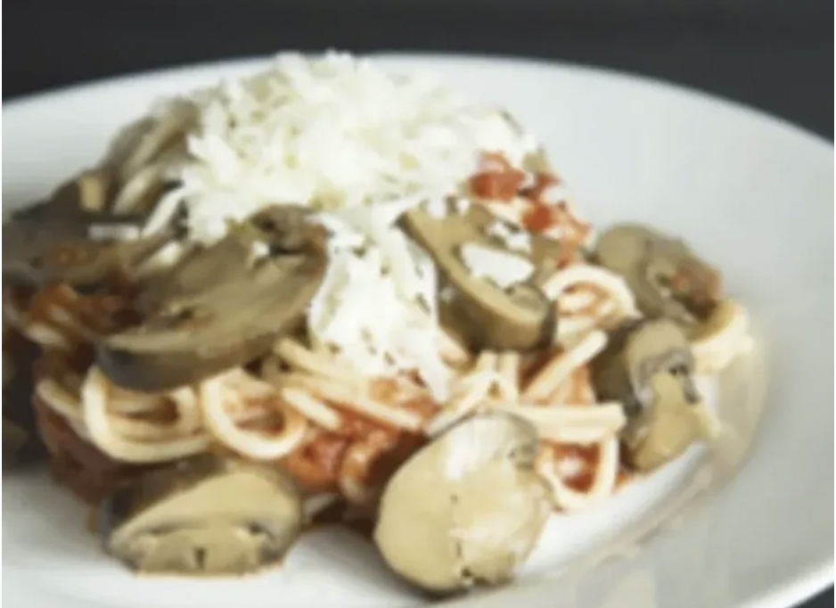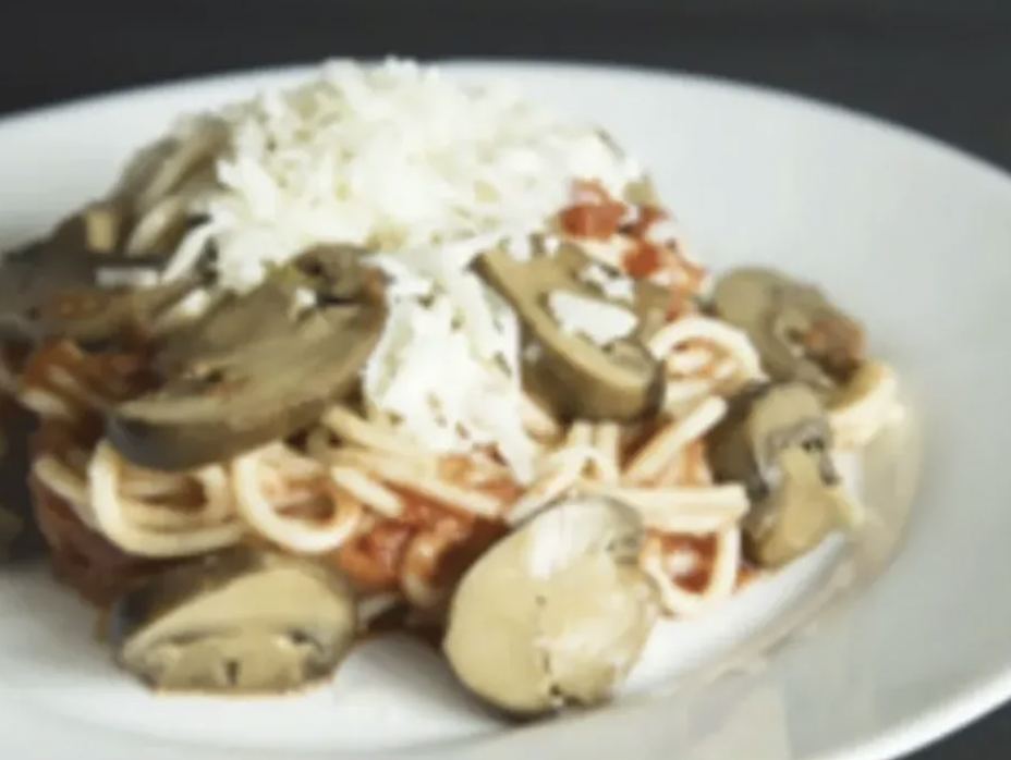 Delicioso espagueti con salsa de tomate, champiñón natural y queso mozzarella.