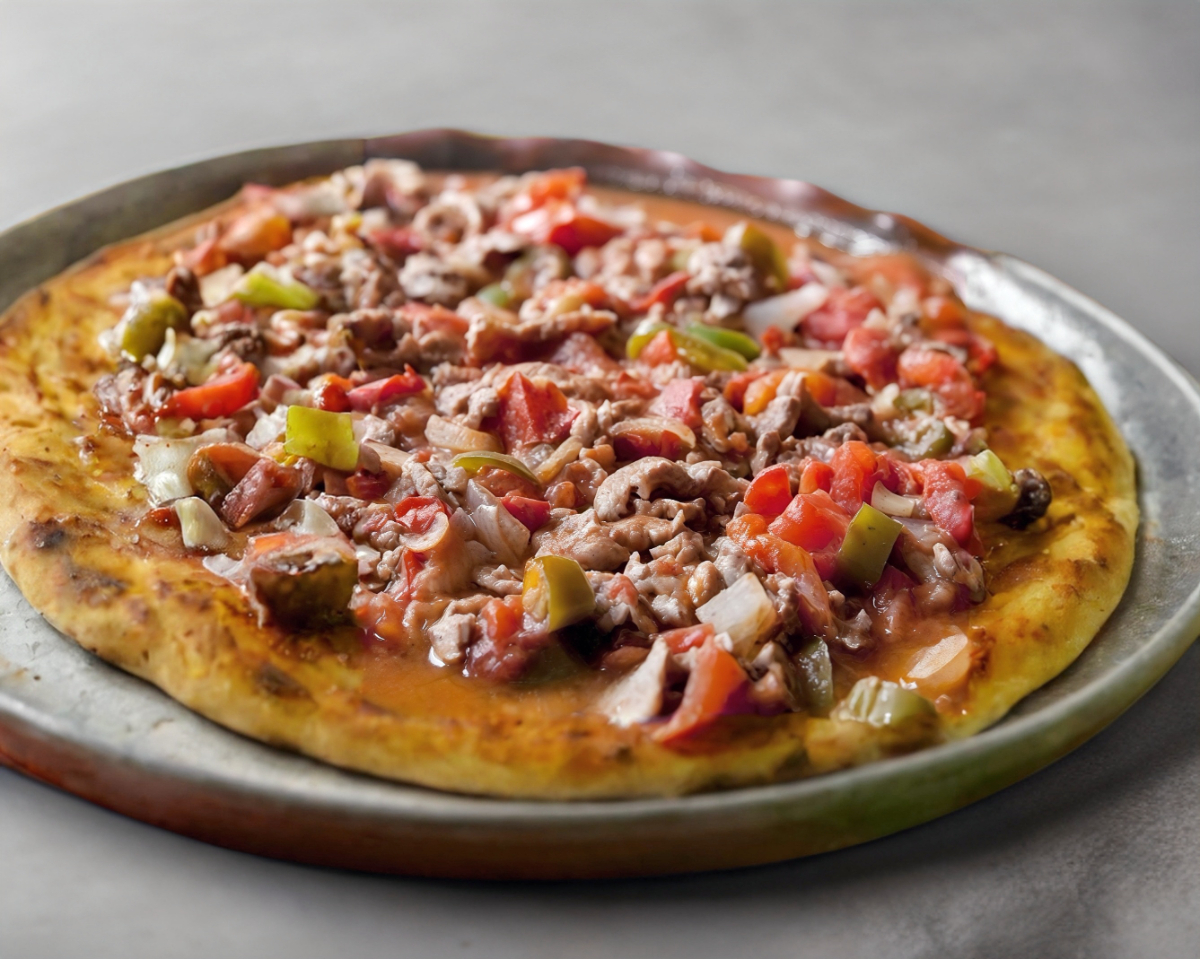 Bistec en trocitos con papa en salsa de tomate con 2 guarniciones, salsa y tortillas