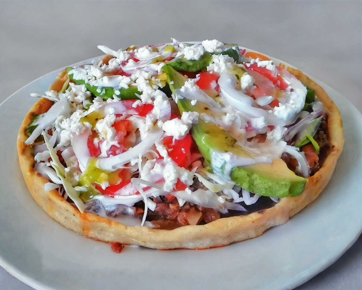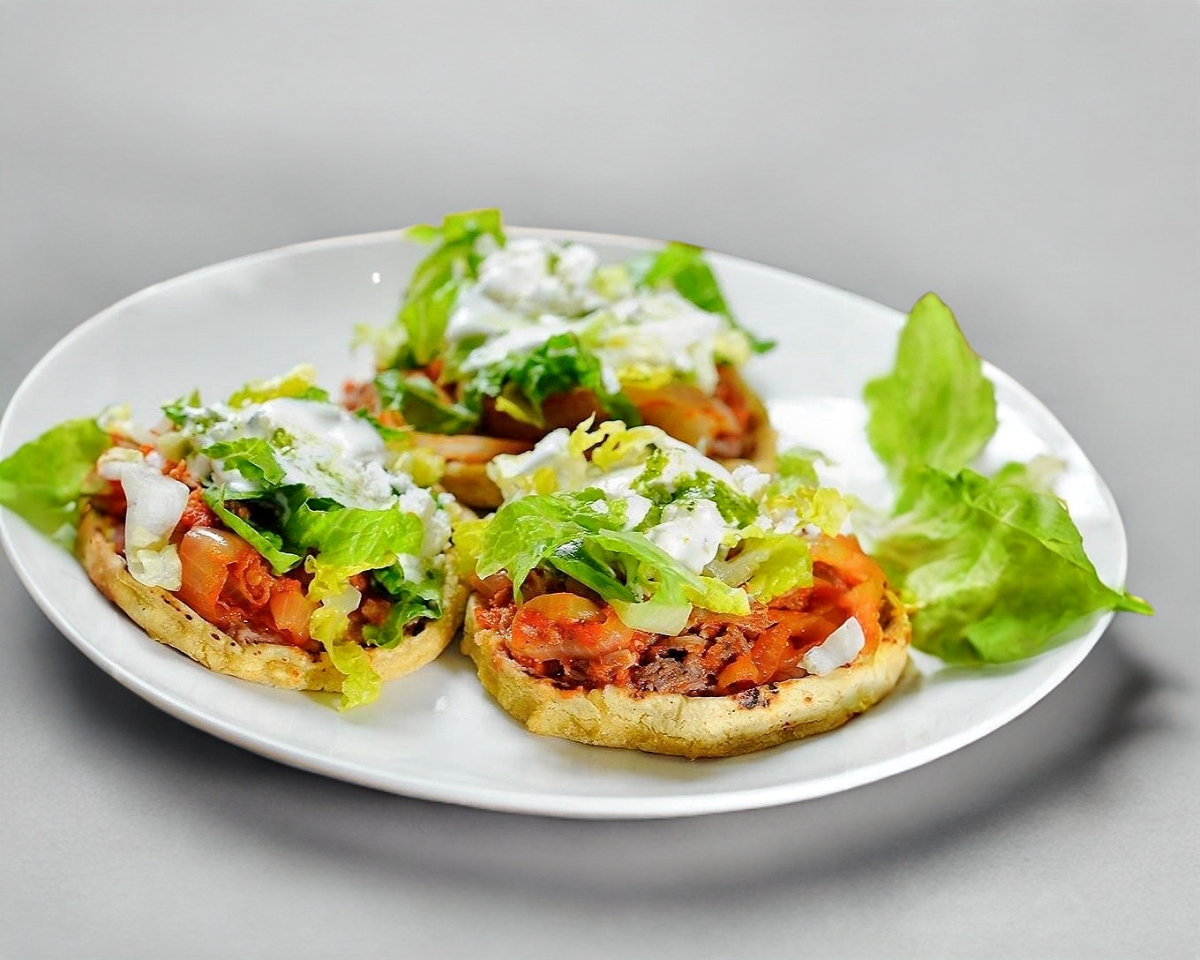 Sope con base de frijol y deshebrada con lechuga, tomate, cebolla, queso y salsa