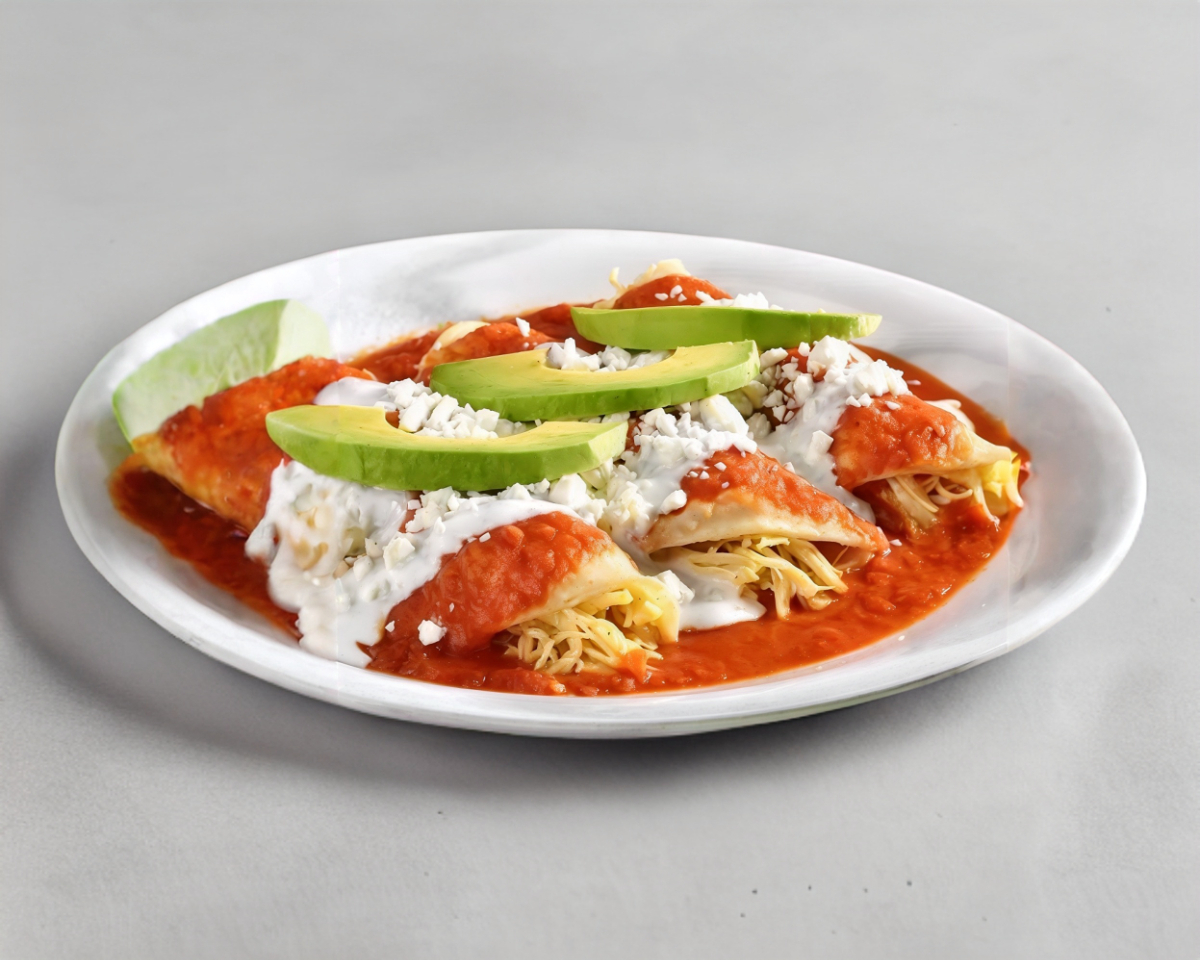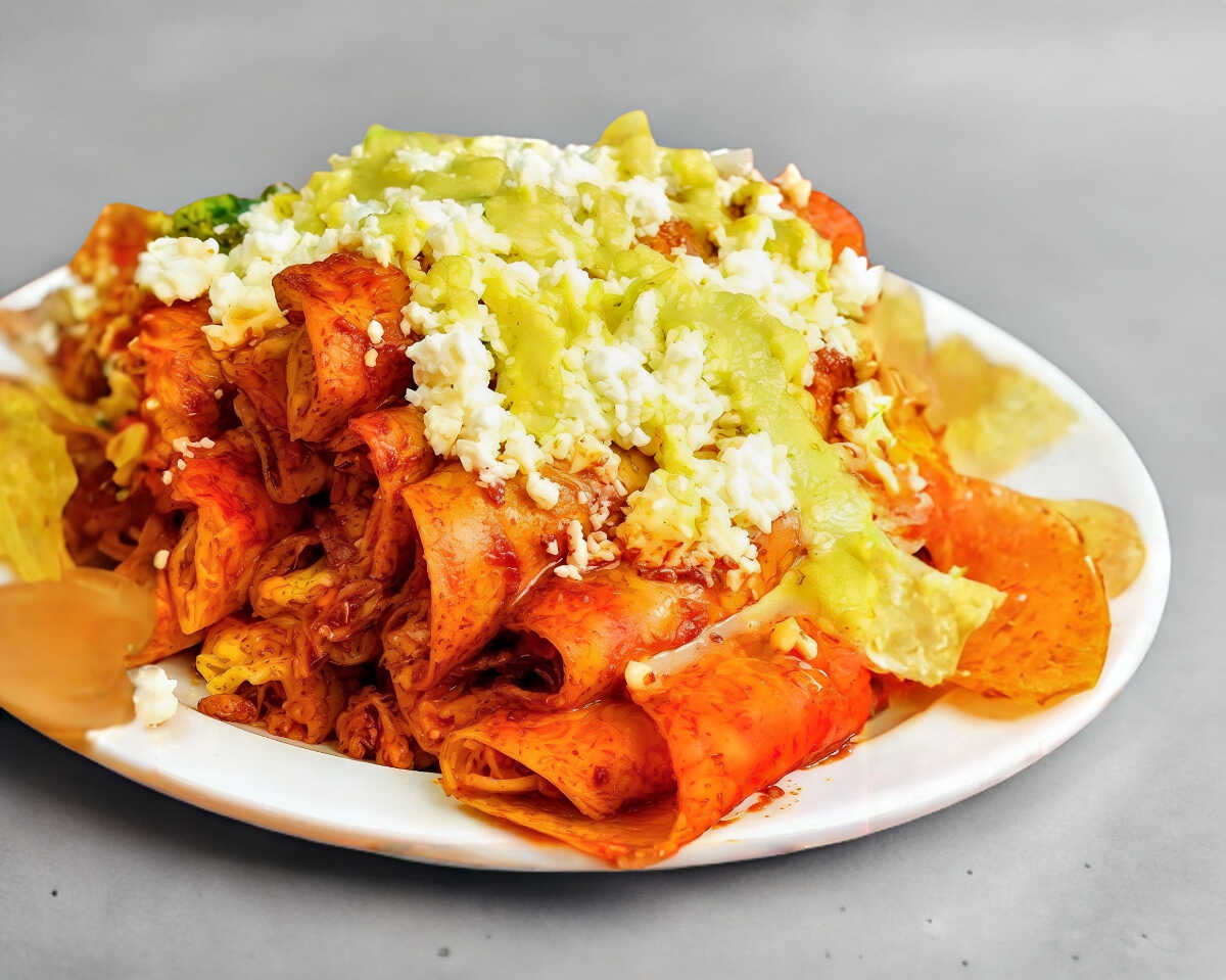 6 tortillas bañadas en salsa roja picante, acompañadas con queso, aguacate, frijoles, crema, salsa y proteína a su elección