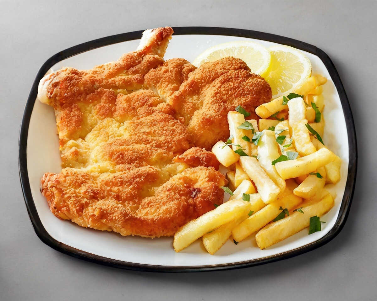 Milanesa de pollo empanizada con dos guarniciones a elección, salsa (a disponibilidad) y 5 tortillas. (Porción personal)