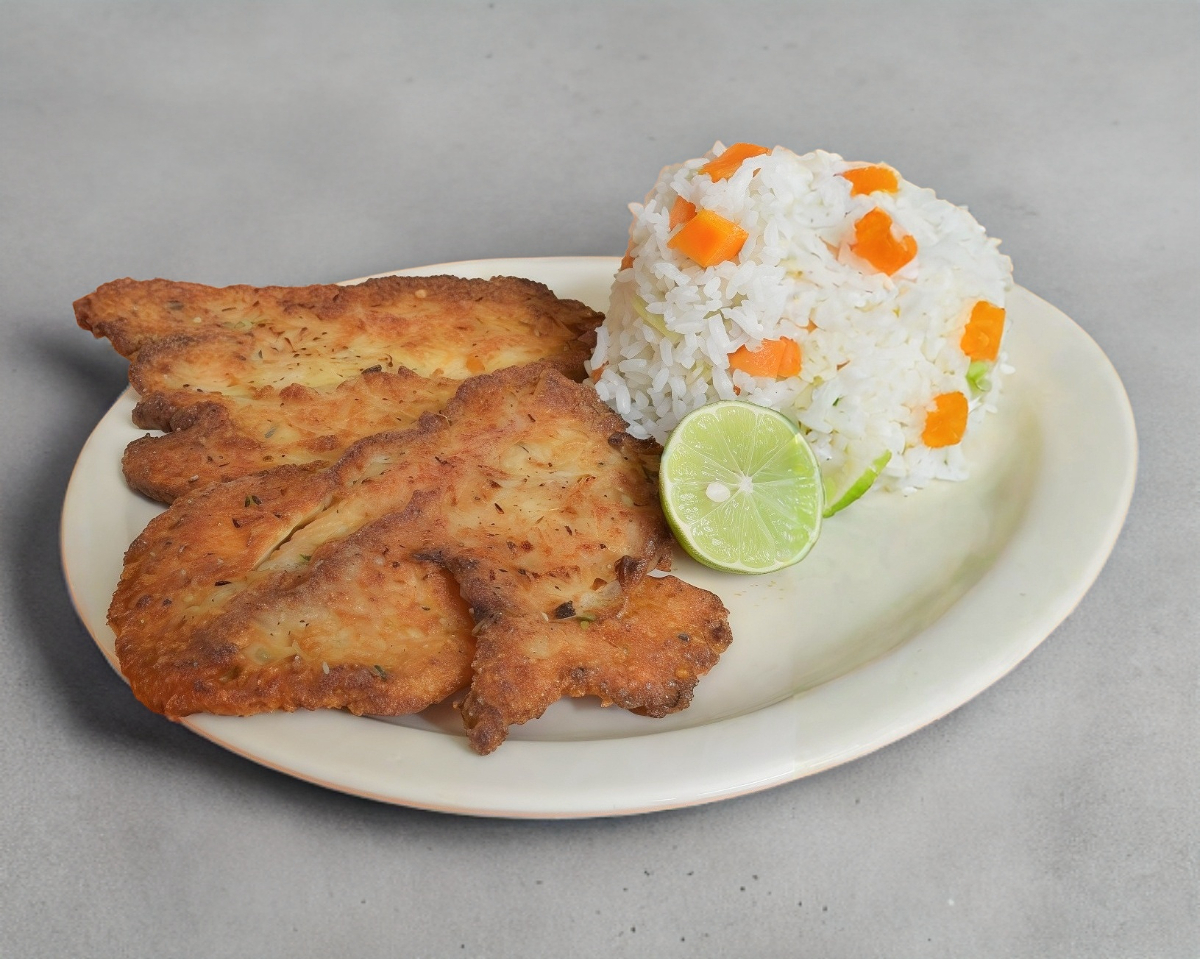 Milanesa de res empanizada con dos guarniciones, salsa y tortillas