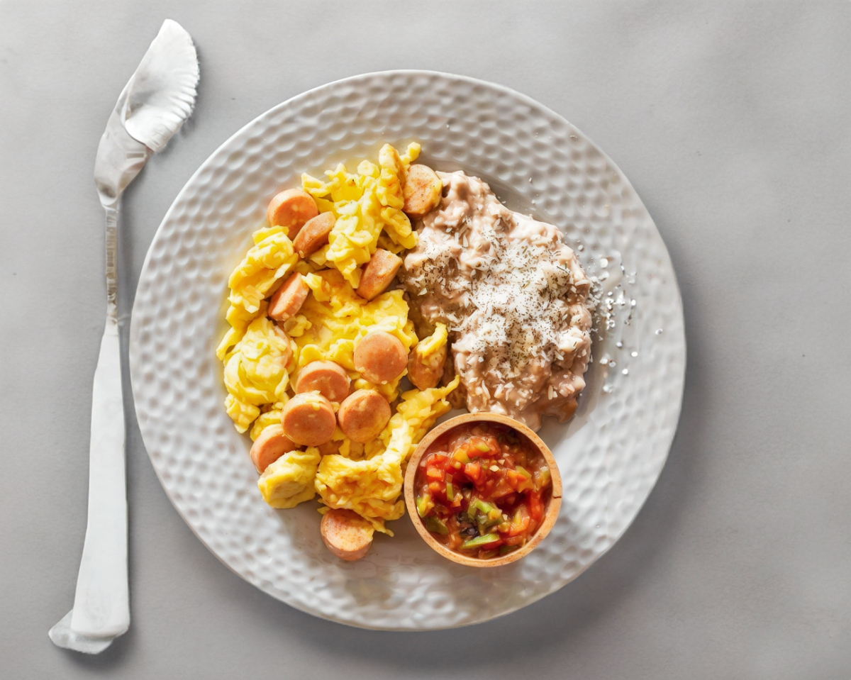3 piezas de huevo revuelto con salchicha, frijoles, queso, salsa y tortillas