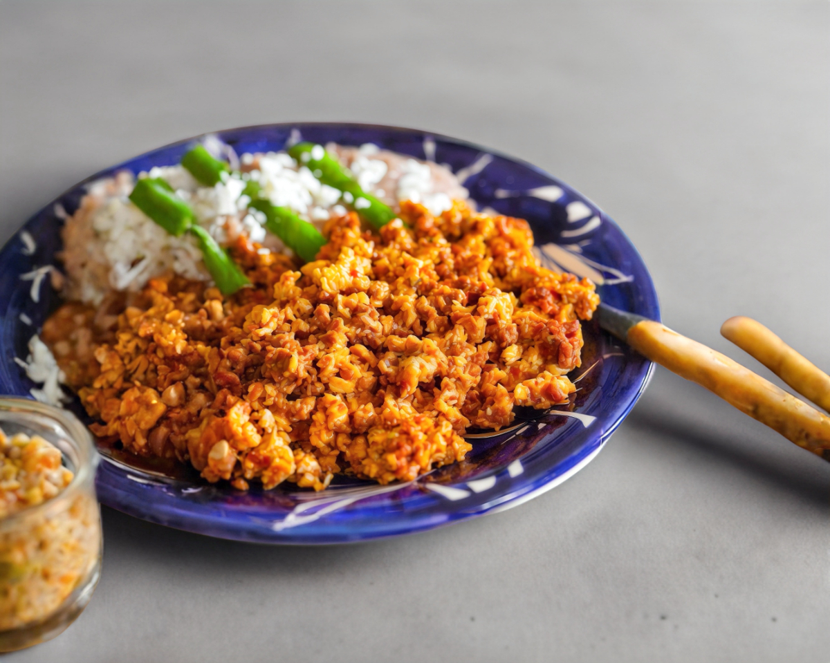 3 piezas de huevo revuelto con tomate, cebolla y chile, frijoles, queso, salsa y tortillas