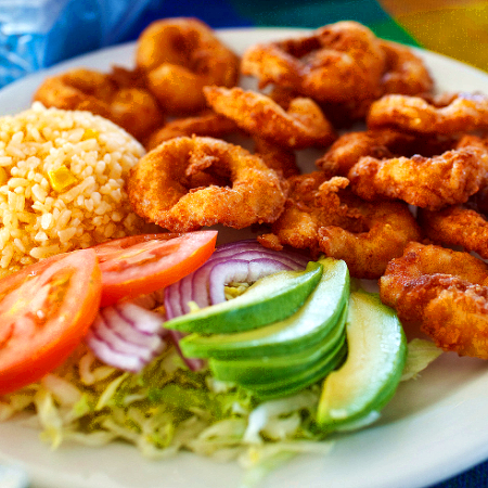 Camarones empanizados en forma de mariposa con 2 guarniciones, tortillas y salsa