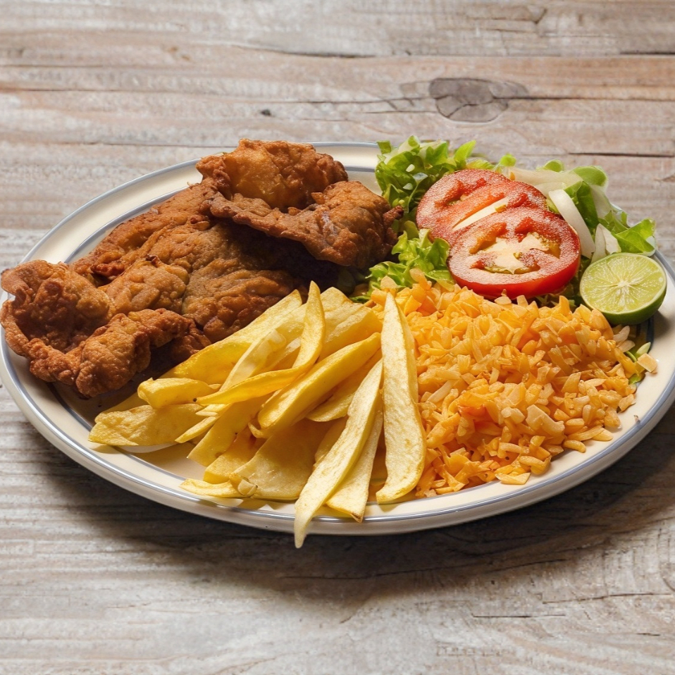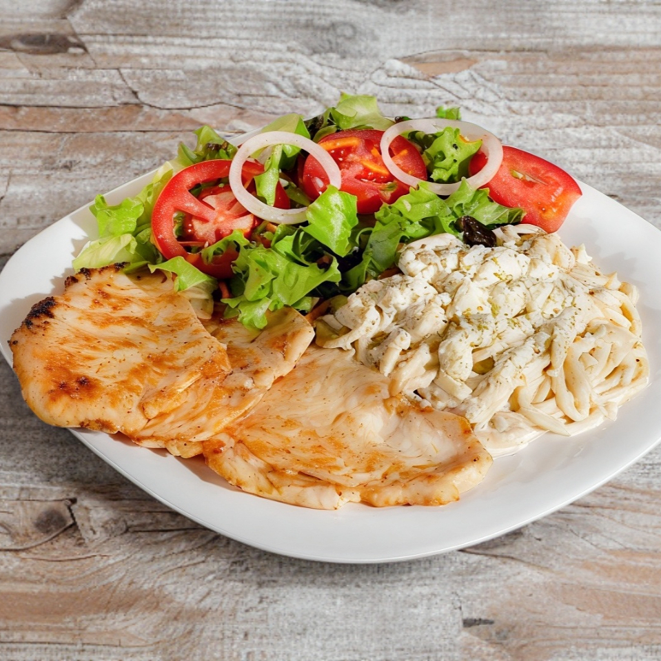 Contiene: pollo a la plancha acompañado con spaghetti o arroz y ensalada.
