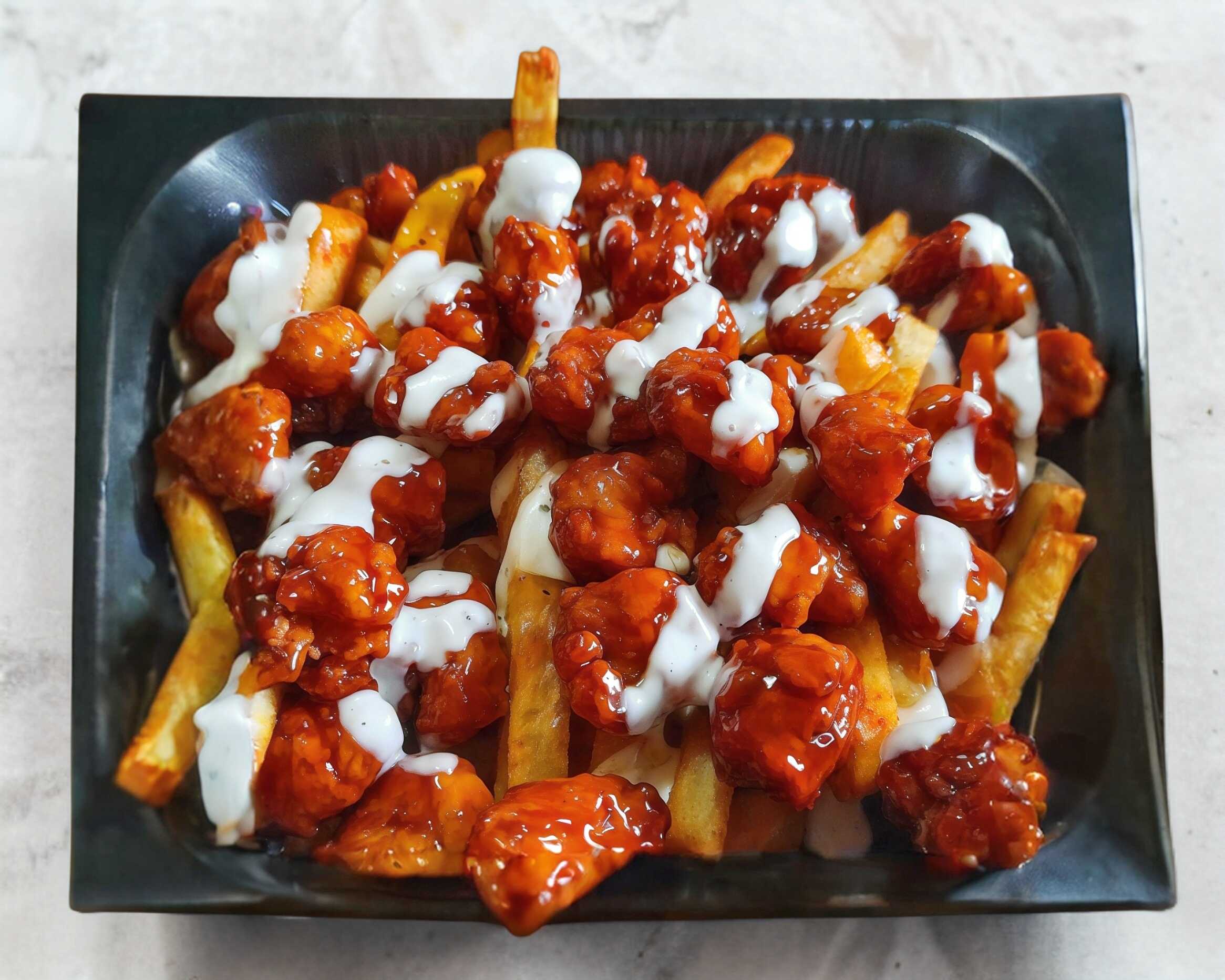 Orden de 300 gramos de papas fritas combinadas con dos salsas que le darán un toque agridulce y 250 gramos de palomitas de pollo escogiendo una salsa. Lleva aderezo ranch encima.