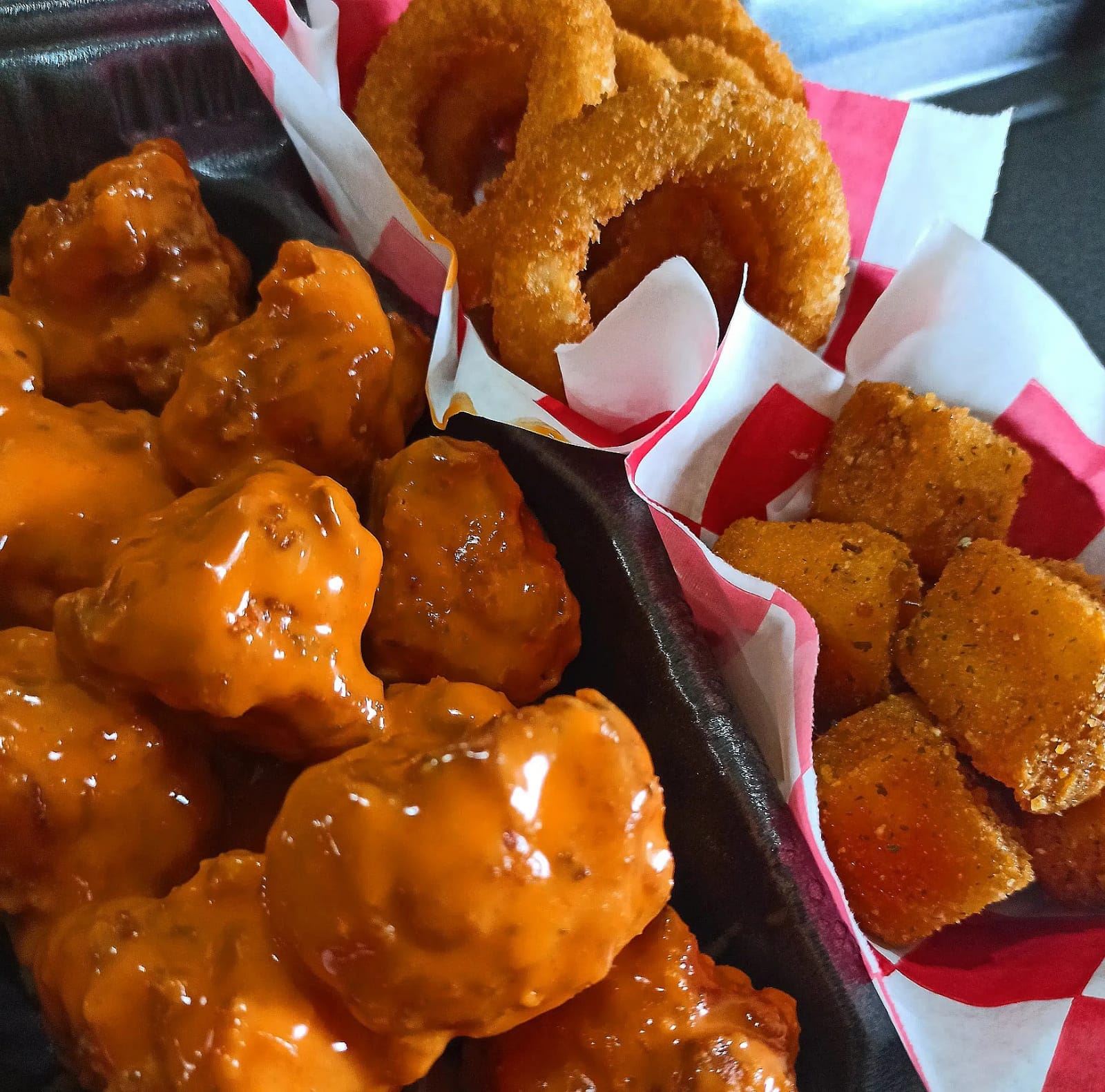 Orden de 15 piezas de boneless con 2 salsas a elegir, acompañada de una orden de papas fritas, aros de cebolla y 6 deditos de queso. Incluye aderezo ranch y vegetales.