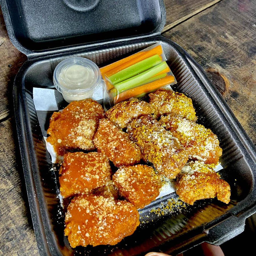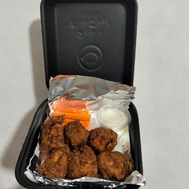 8-10 trozos de pechuga sazonada y frita echos al momento,acompañados de sus papas fritas acompañados de verdura y aderezo ranch de 2oz