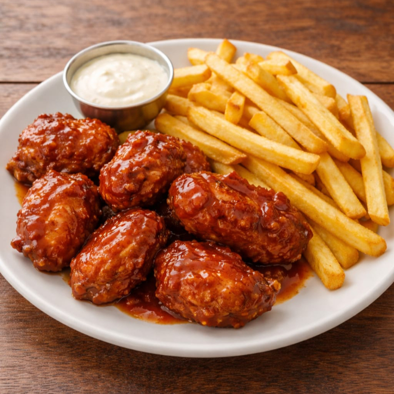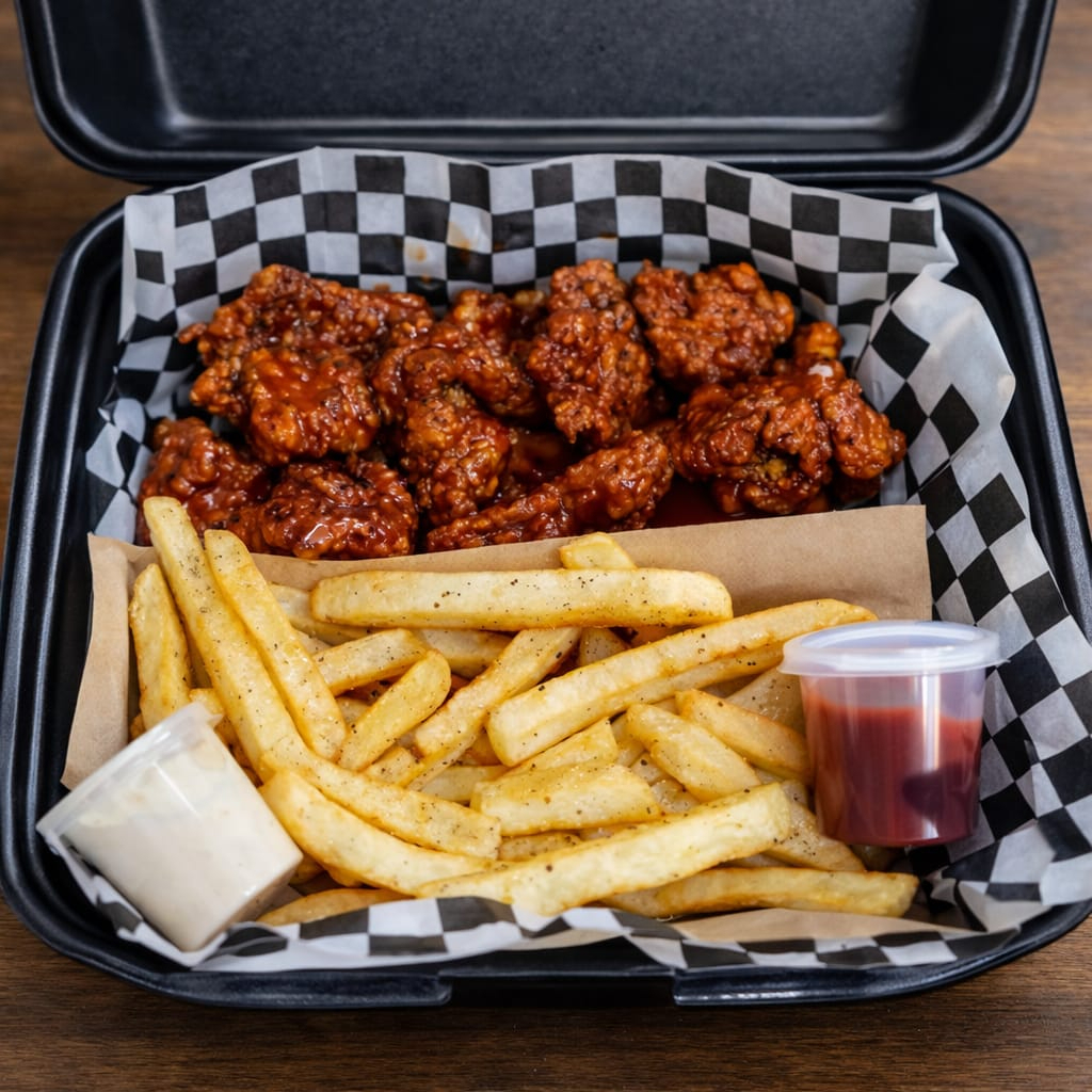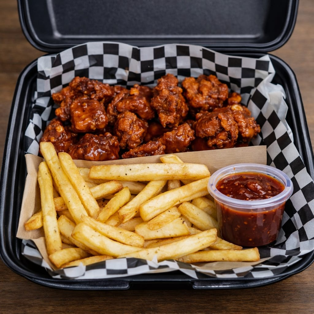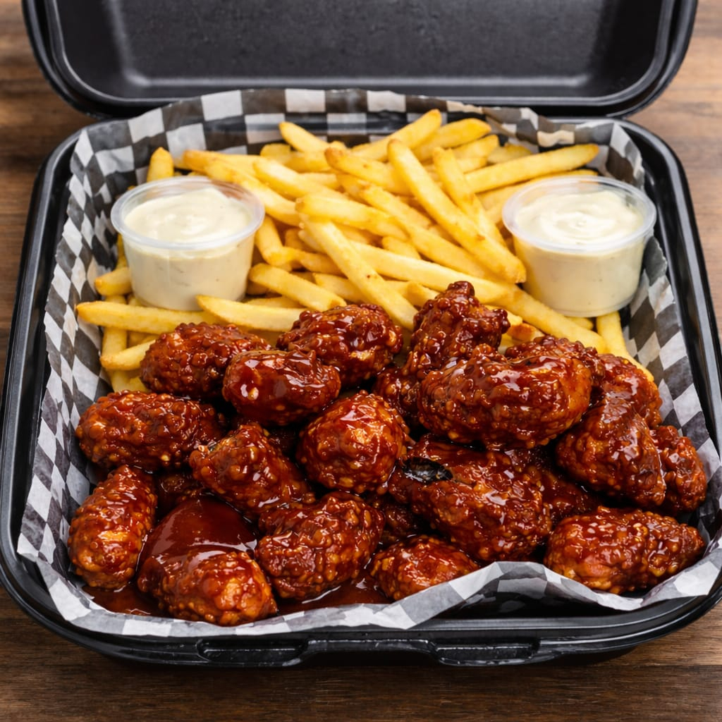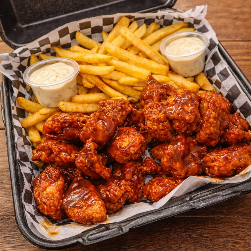 250 gr de Boneless con una cama de 400 gr de papas fritas ideal para los amantes de las papas