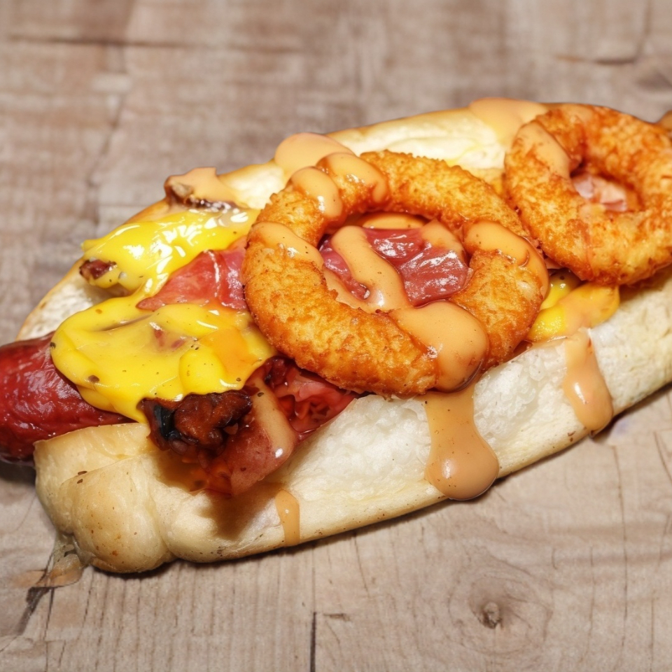 Salchicha jumbo, tocino,cheddar, aderezo ahumado 3 aros de cebolla crujientes.