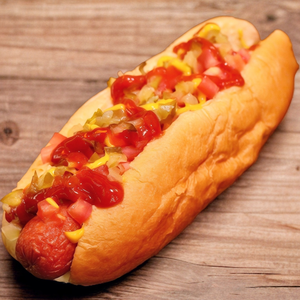 Pan brioche, salchicha jumbo, pepinillos, cebolla, tomate y aderezos.