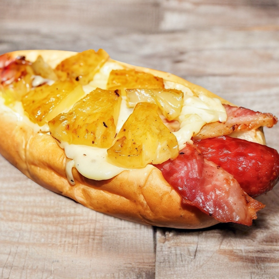 Salchicha jumbo, pan brioche piña caramelizada, tocino, queso mozzarella aderezo especial