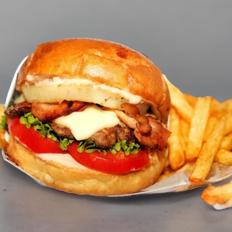 150g carne, rodaja de piña a la plancha, tocino, lechuga italiana, queso mozzarella y aderezo especial, acompañado de 130g papas y aderezo