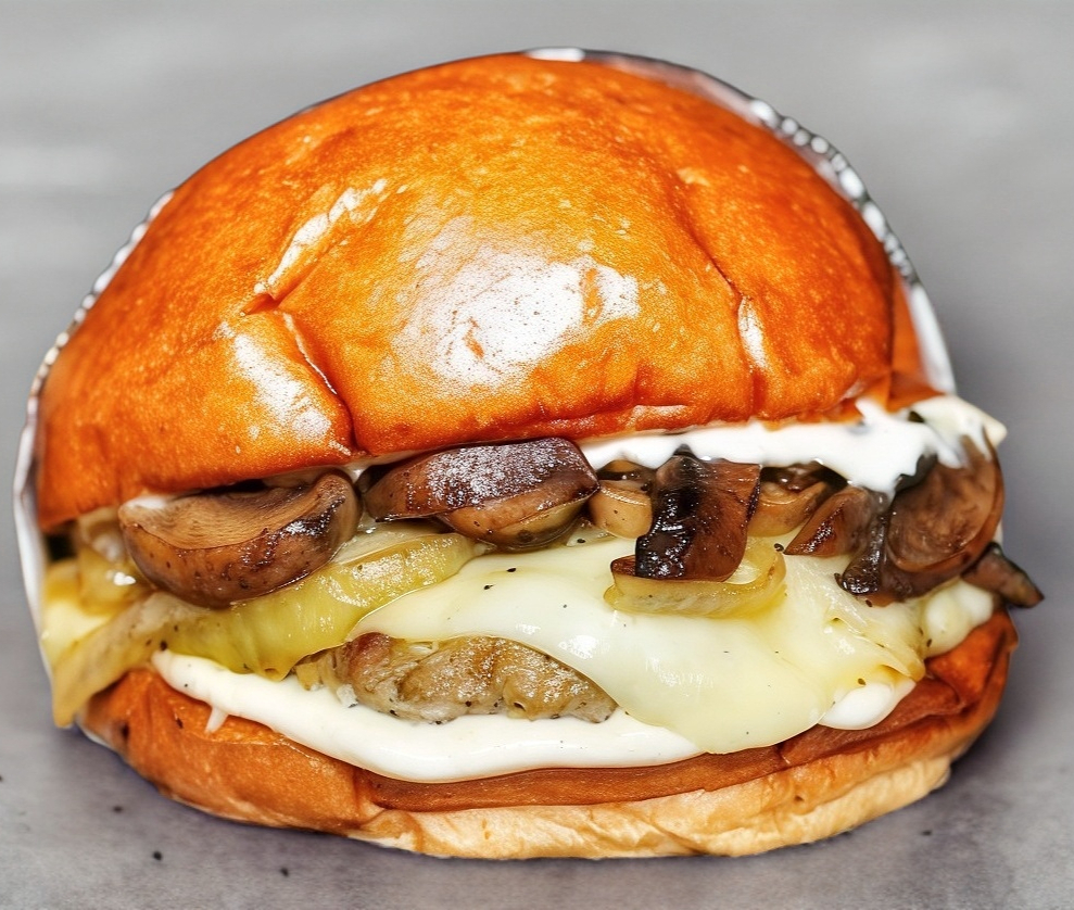 150 g de carne, Mezcla de champiñones, cebollas caramelizadas, queso mozzarella y mayonesa. acompañado 130g papas y aderezo