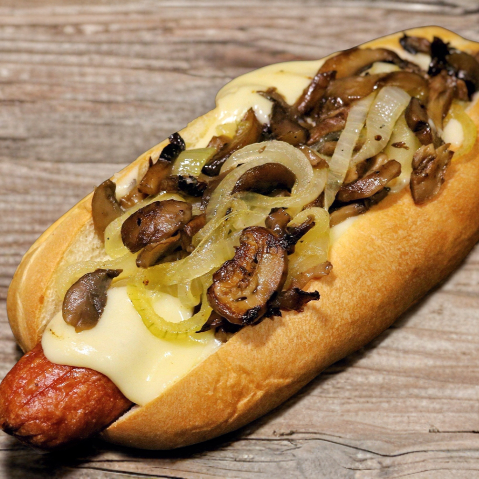 Salchicha jumbo, mix de champiñones, cebolla caramelizada y queso mozzarella