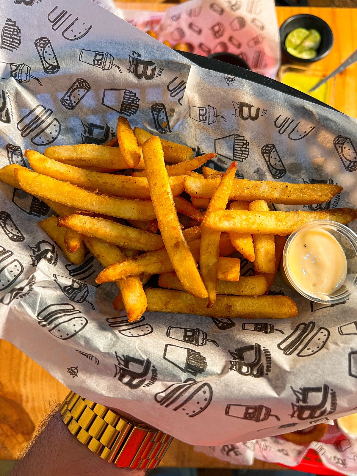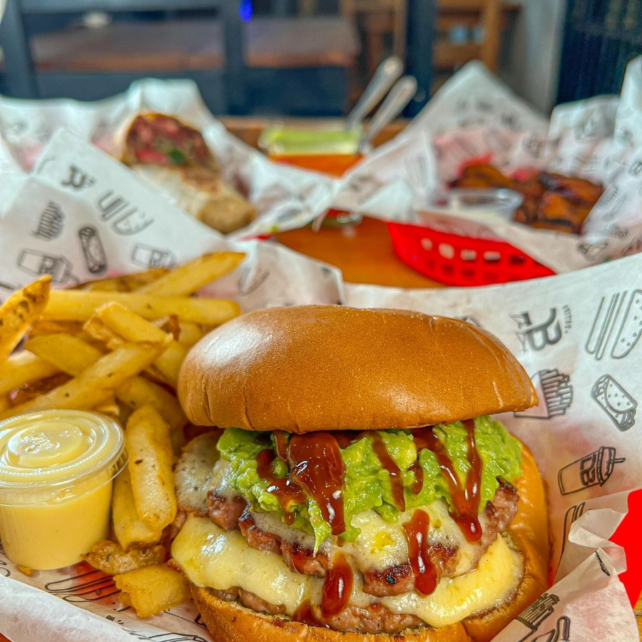 Pan brioche, doble carne de res, bbq, doble queso gouda y guacamole natural. Acompañado de papas fritas
