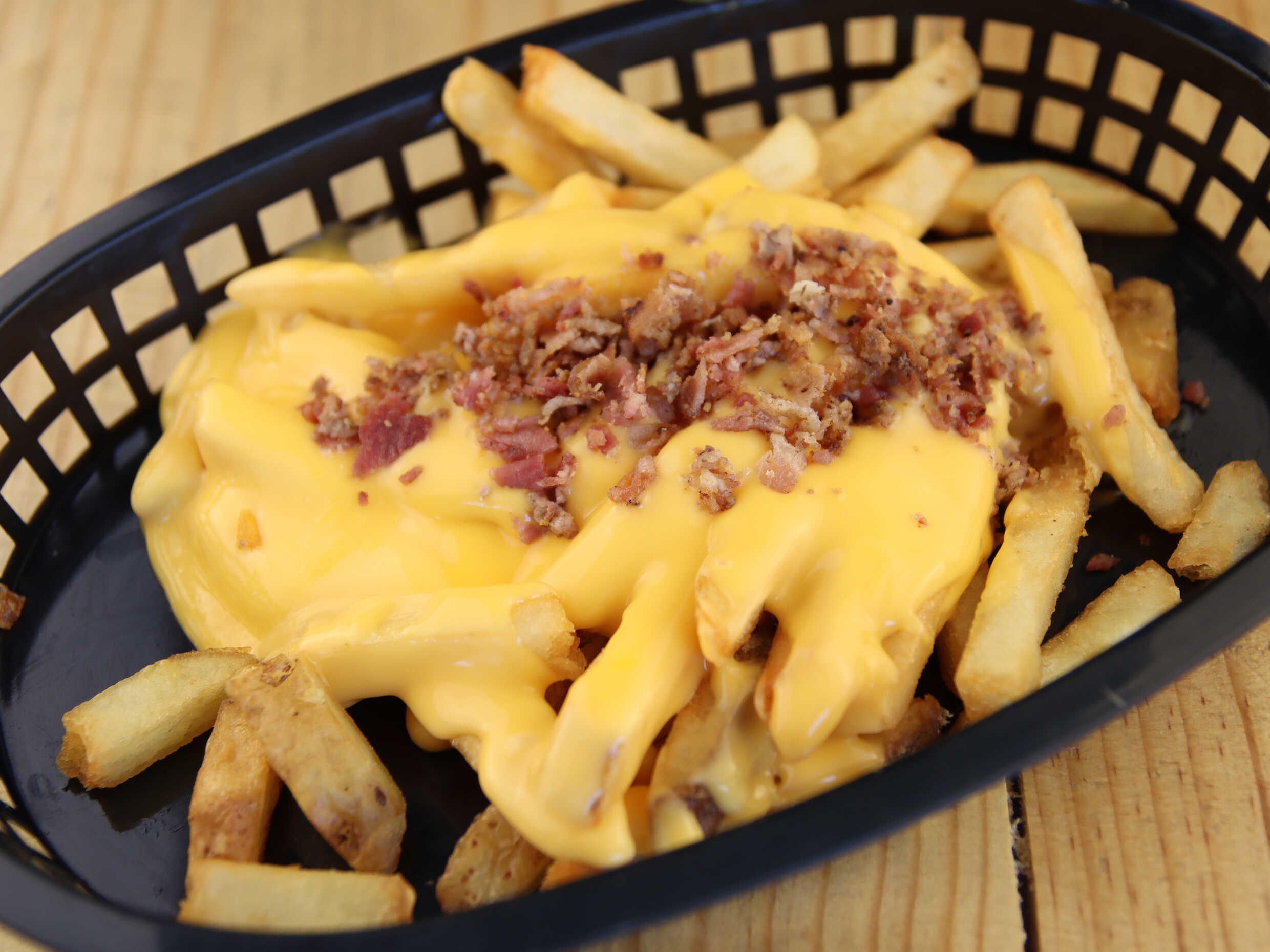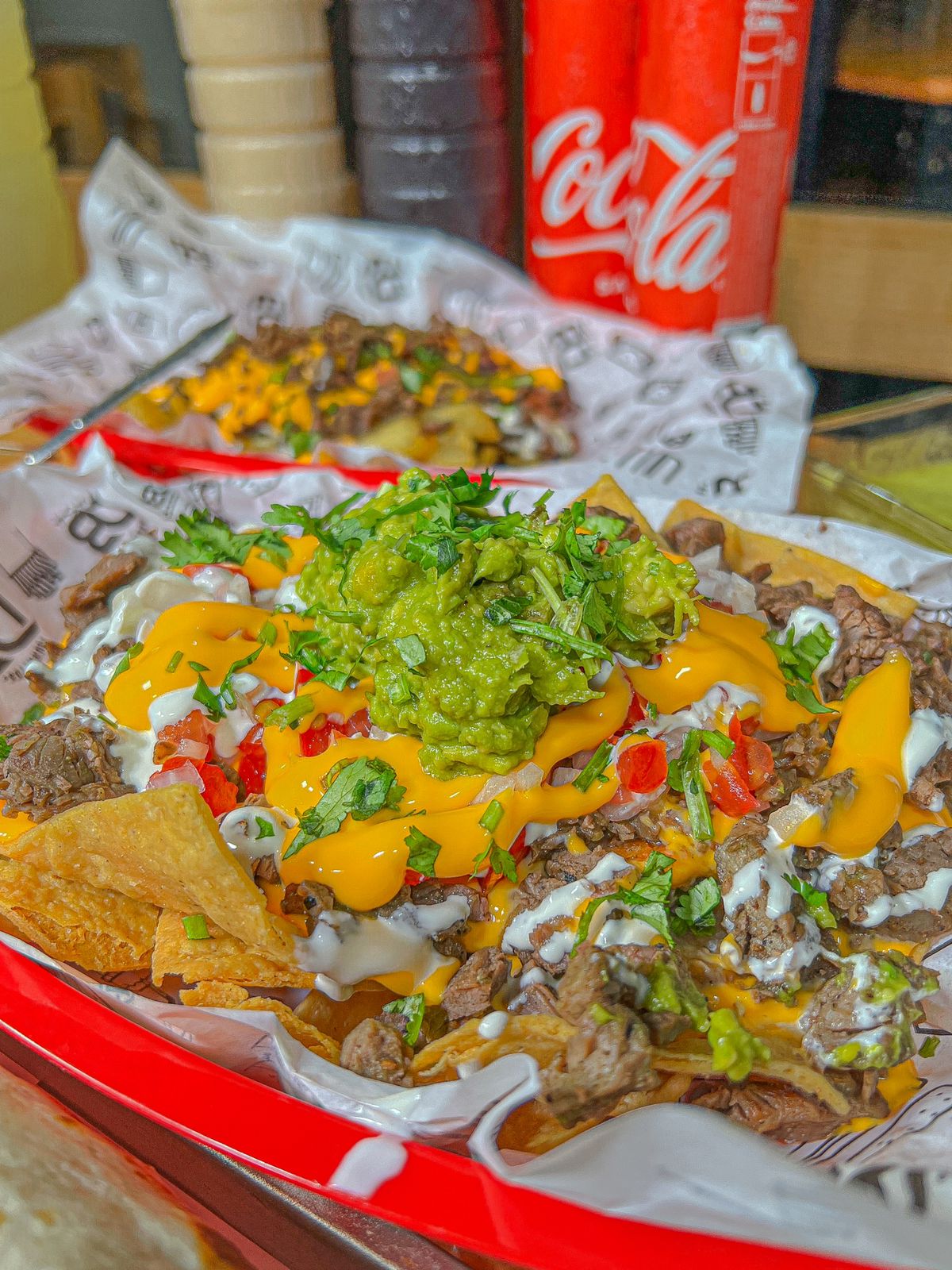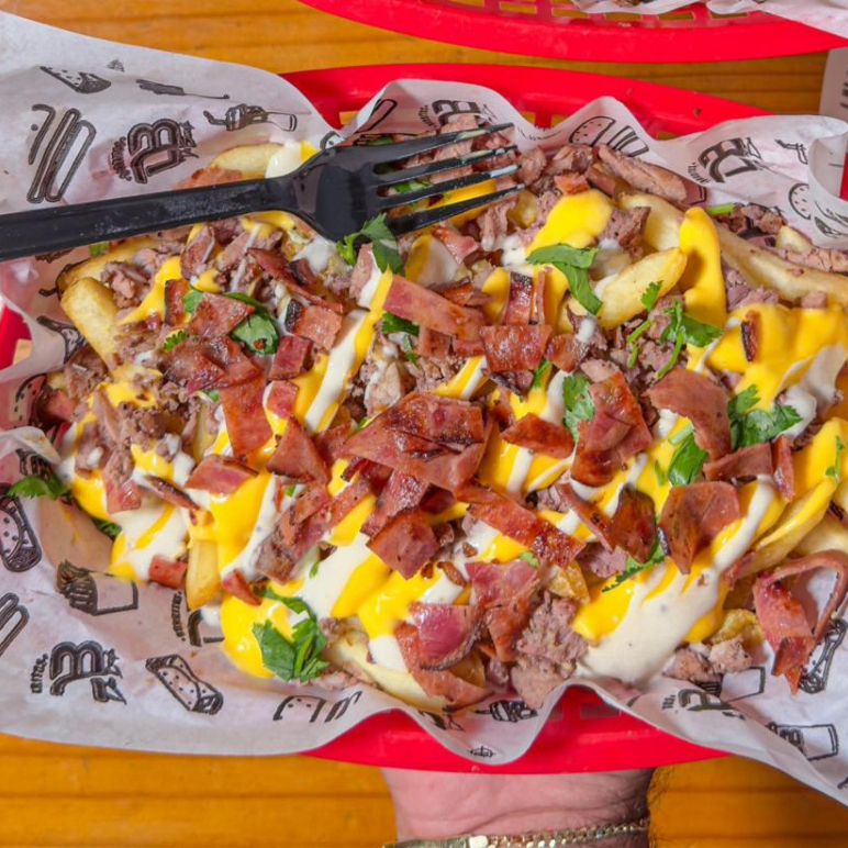 Papas fritas servidas con asada, queso, aderezo ranch y tocino.