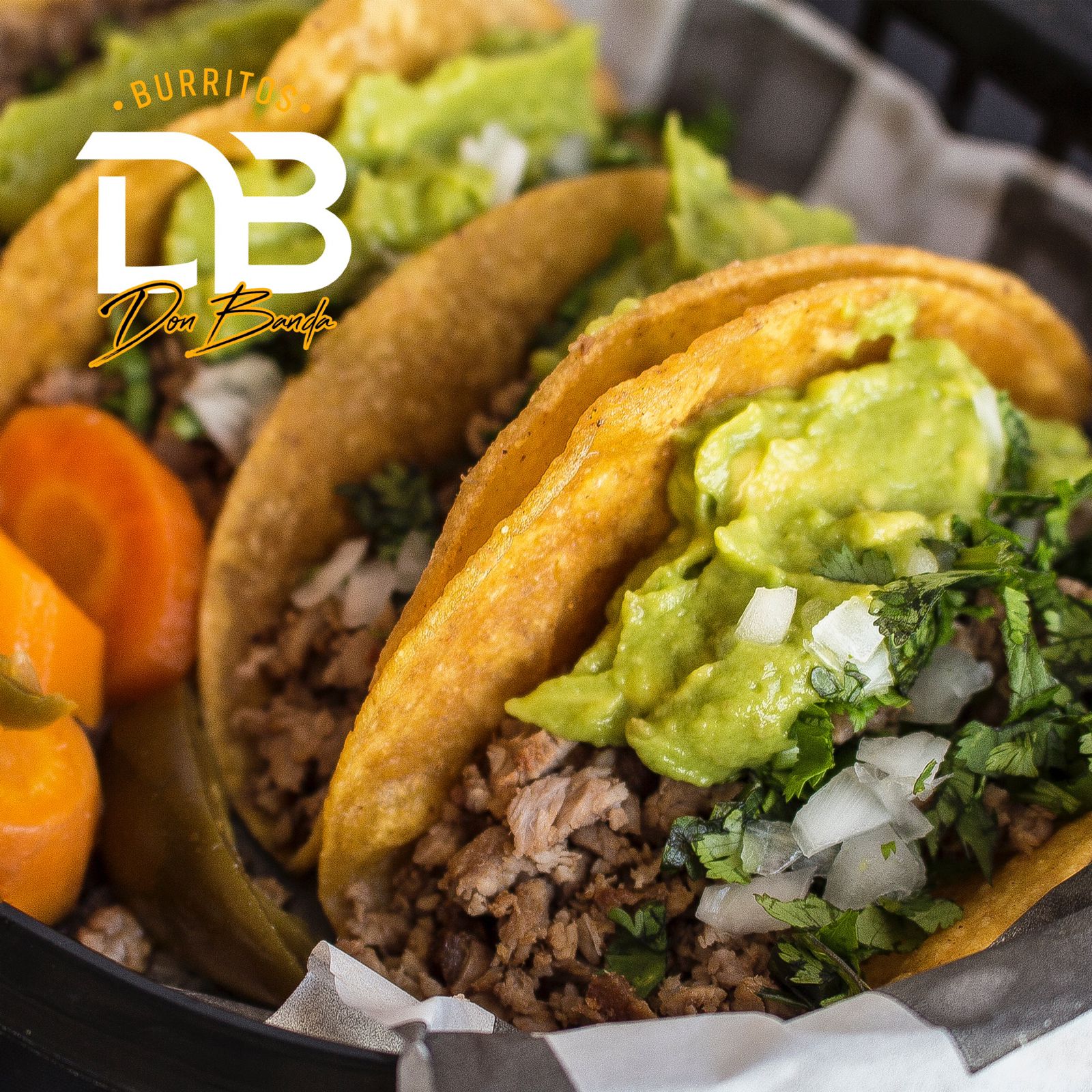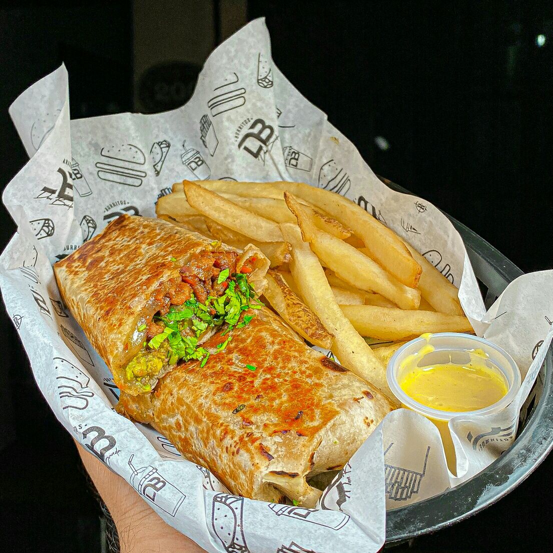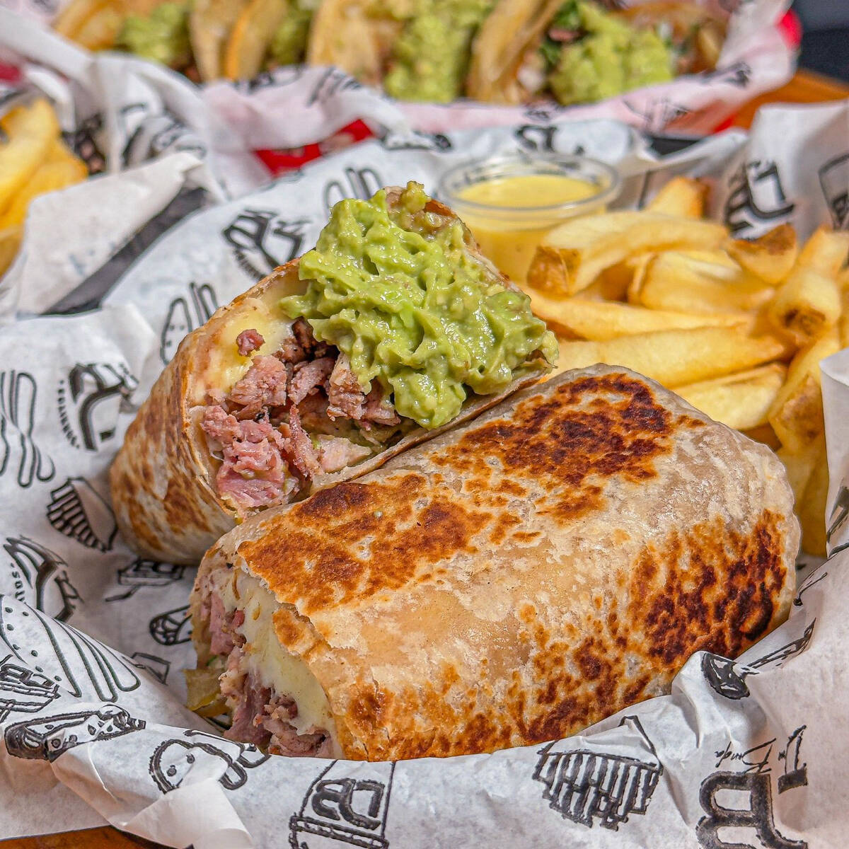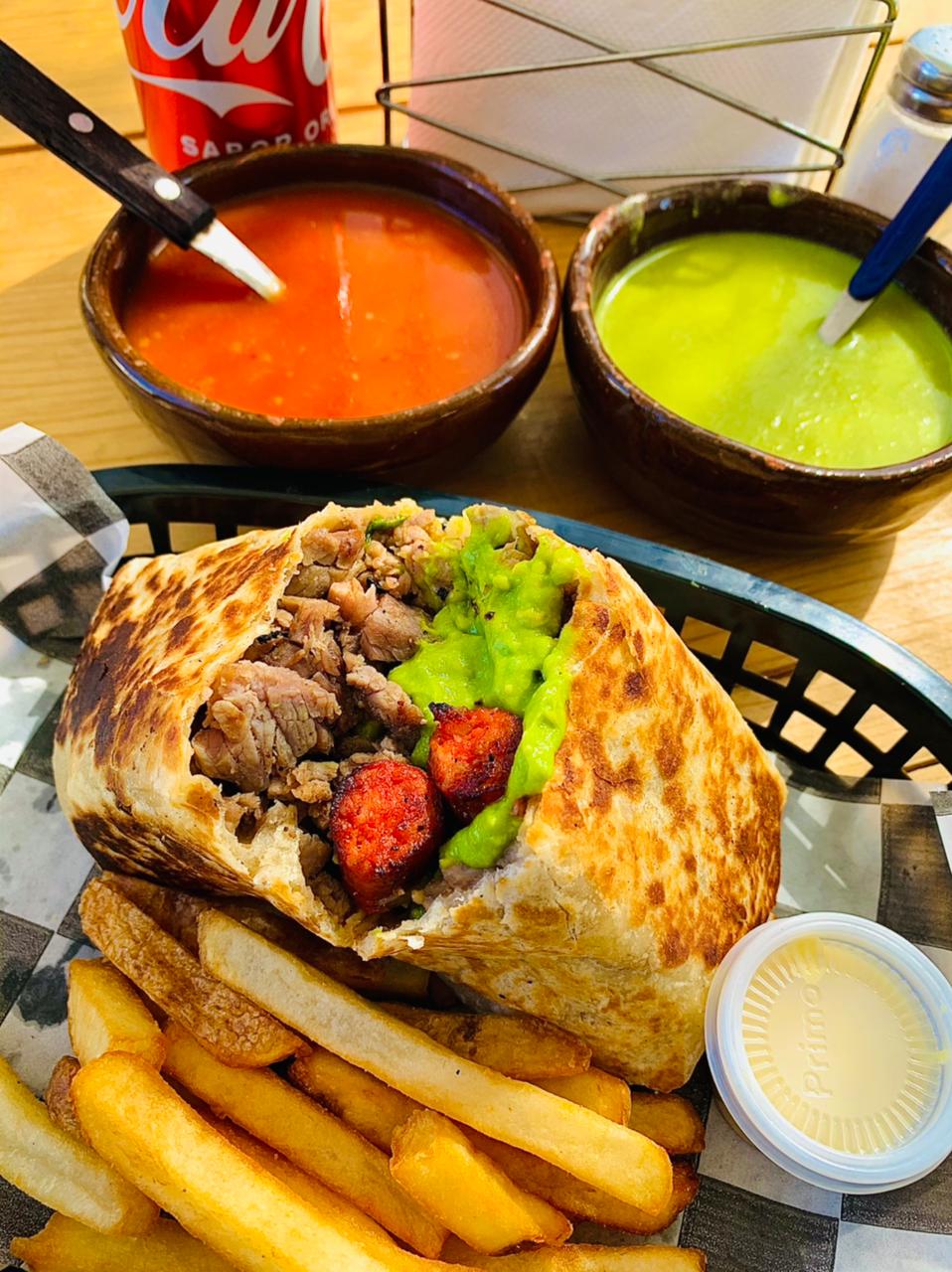 Tortilla burrera untado de frijoles bayos, queso gouda, trompo, cilantro, cebolla cocida y guacamole natural. Acompañado de papas a la francesa.