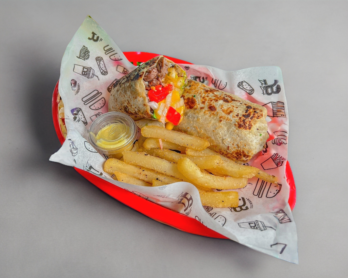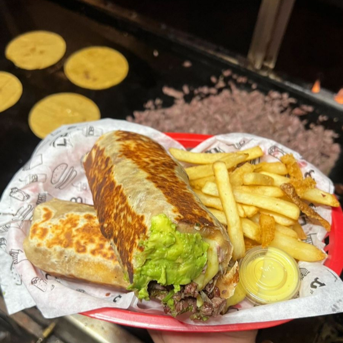 Tortilla burrera untado de frijoles bayos, queso gouda, arrachera, salchichón, salchicha polaca, cilantro, cebolla cocida y guacamole natural. Acompañado de papas a la francesa.