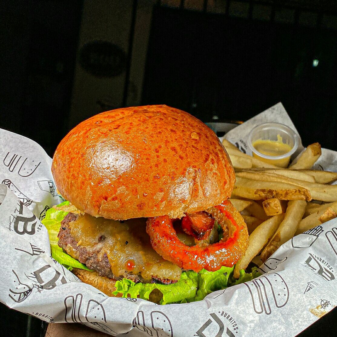Pan brioche, carne de res, BBQ, lechuga sangría, queso monterey jack colby, aros de cebolla y tocino. Acompañado de papas fritas.