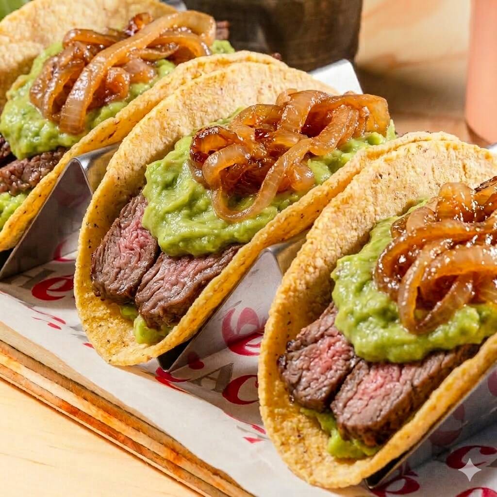 Lámina de res suave con guacamole y cebollas caramelizadas.