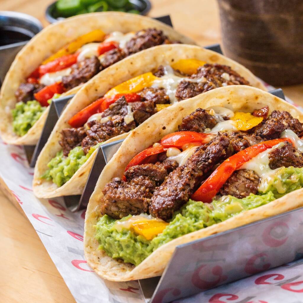 Tiras de fajita marinadas al estilo tradicional, con pimientos, queso asadero, y guacamole.