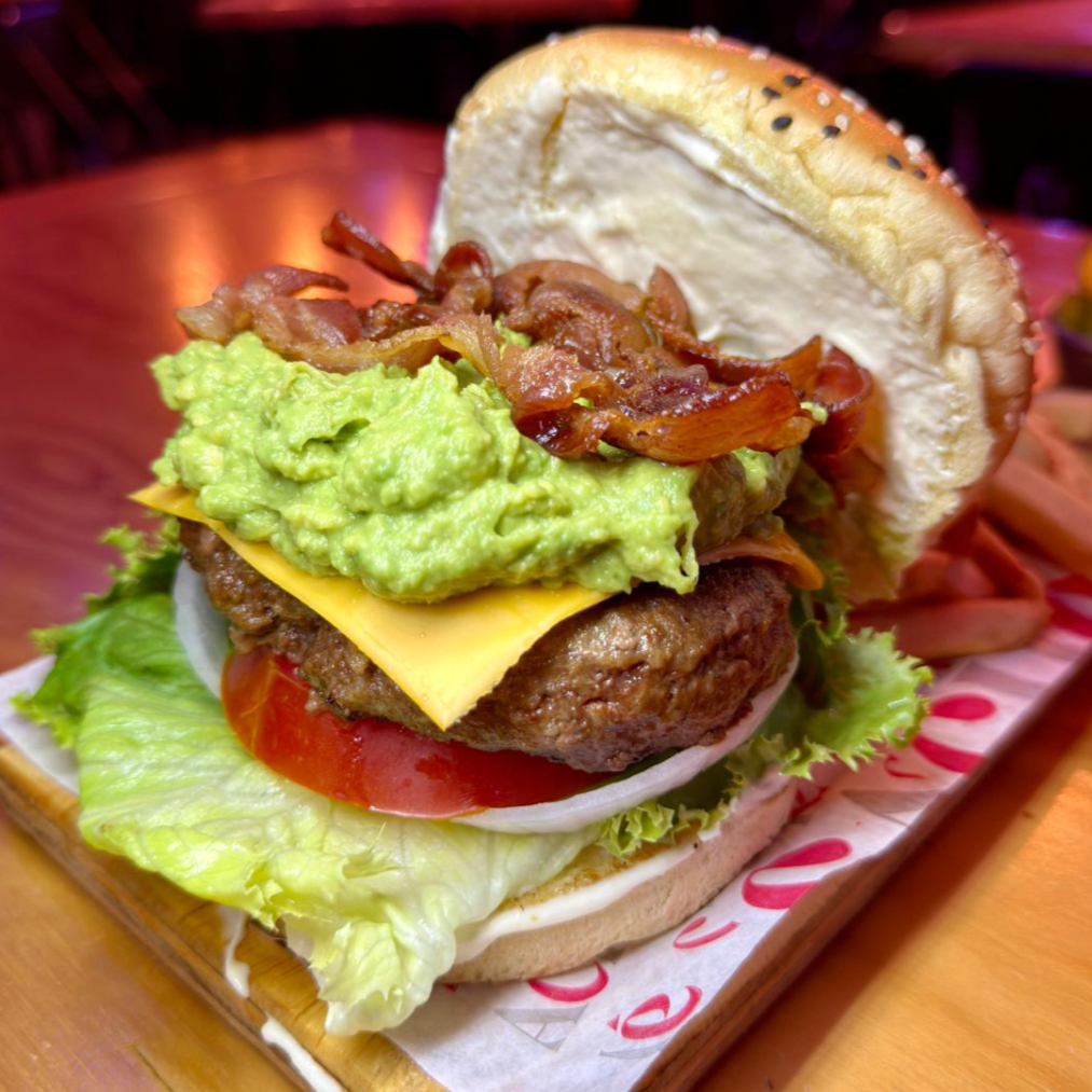 Rica carne de res con delicioso guacamole, lechuga, queso amarillo, tocino, tomate, cebolla y mayonesa