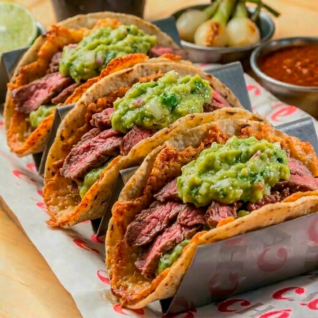 Fajita finamente picada en costra de queso, coronado, con abundante guacamole.